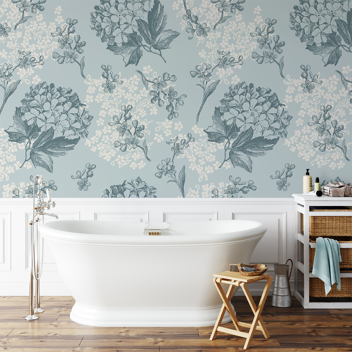 Fototapeta „Błękitna Nostalgia” – subtelna elegancja, kwiatowy spokój i ponadczasowy styl
