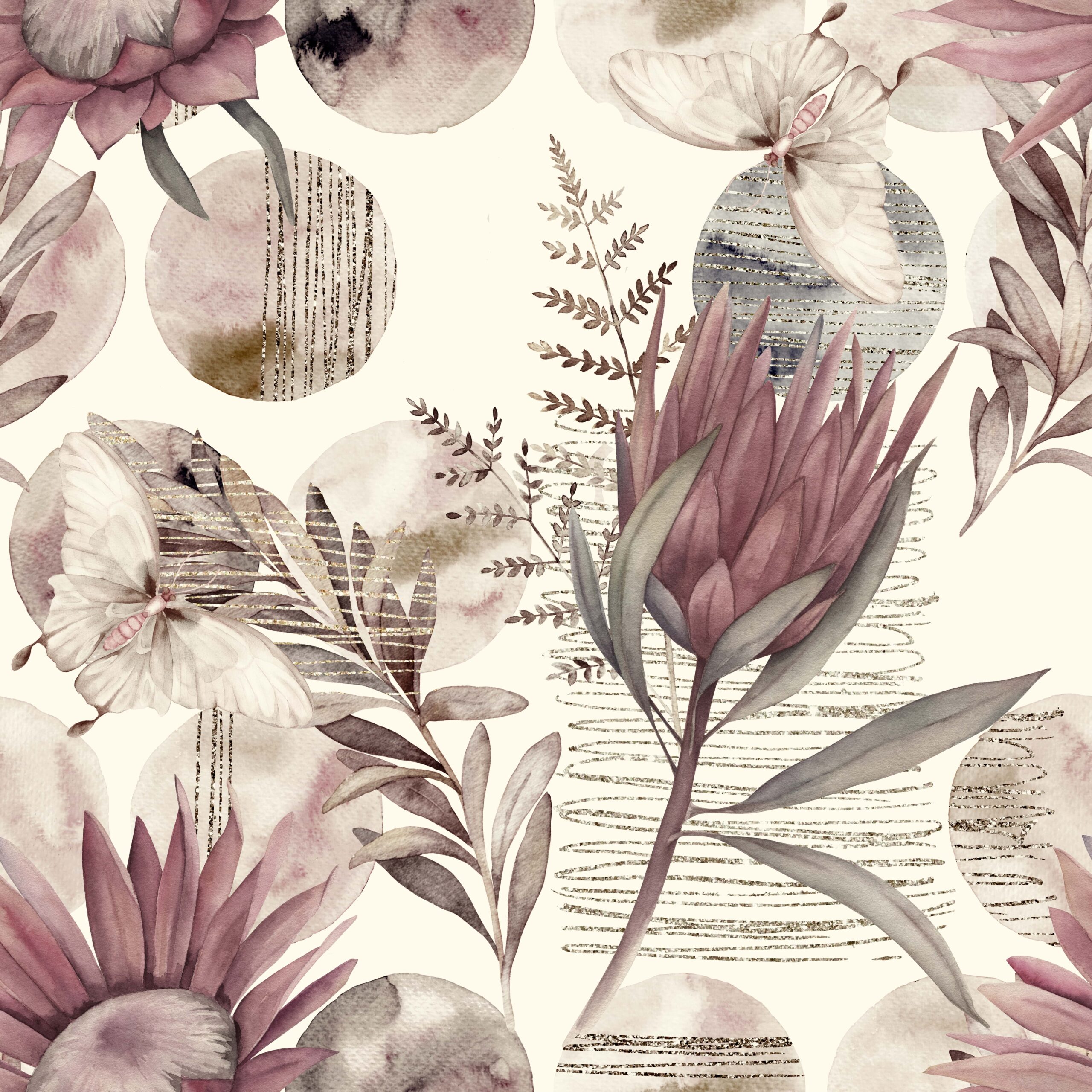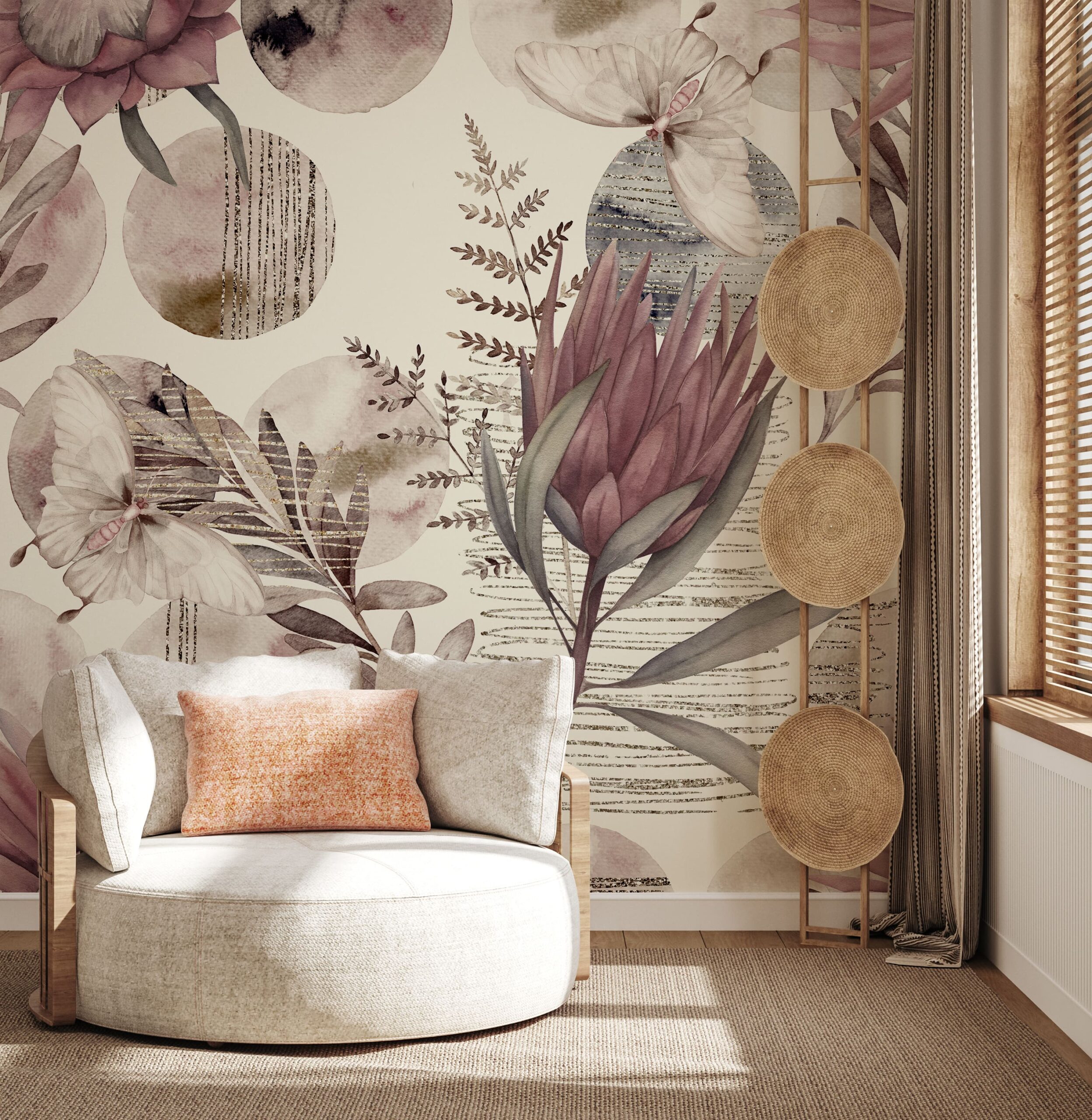 Wprowadź do swojego wnętrza wyjątkowy nastrój dzięki fototapecie „Botaniczna Melodia”. Ten delikatny, akwarelowy wzór inspirowany naturą łączy motywy kwiatów, liści i motyli z miękkimi, stonowanymi barwami różu, beżu i szarości. Wzbogacona o złociste detale i graficzne tekstury kompozycja tworzy elegancką i nastrojową atmosferę pełną wdzięku.