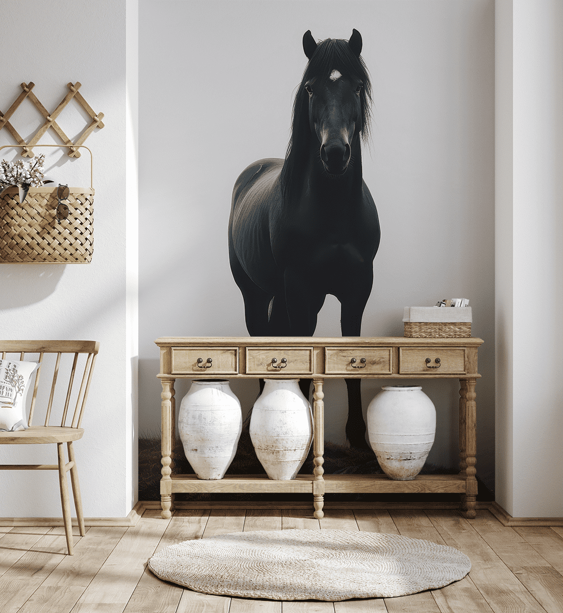 Wprowadź do swojego wnętrza wyjątkową atmosferę dzięki fototapecie „Czarny Koń”. Ta poruszająca, pełna głębi kompozycja ukazuje potęgę i piękno konia stojącego na tle delikatnej mgły, tworząc jednocześnie obraz pełen spokoju i dzikiej natury. Kontrastowe zestawienie ciemnej sylwetki z jasnym tłem przyciąga wzrok i wprowadza do pomieszczenia nutę tajemniczości i elegancji.