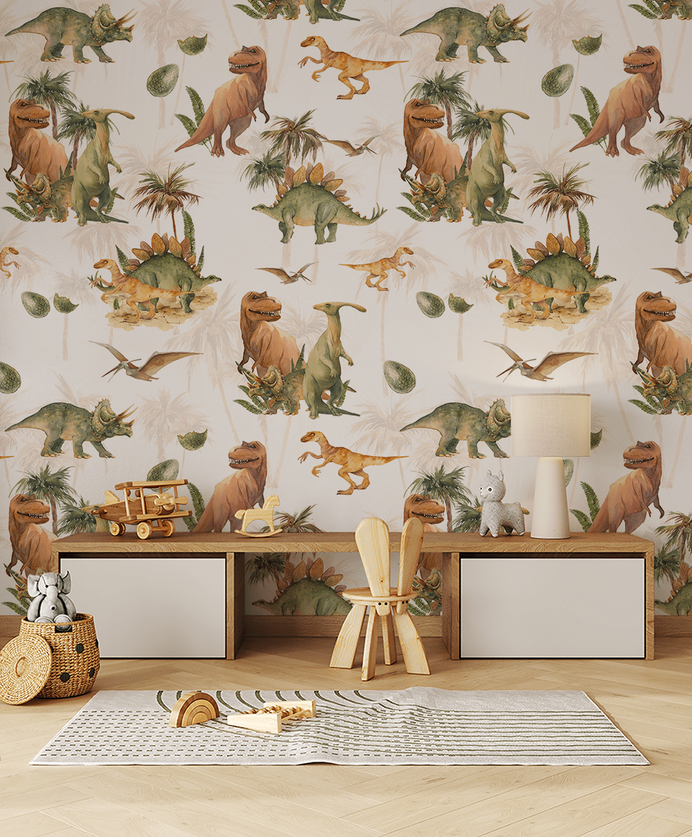 Zamień pokój dziecka w fascynującą krainę pełną przygód dzięki fototapecie „Dinozaury z Dżungli”. Ten kolorowy, pełen życia wzór przenosi malucha w sam środek pradawnej dżungli, gdzie mieszkają sympatyczne dinozaury, egzotyczne rośliny i tajemnicze jaja dinozaurów. Każdy szczegół został zaprojektowany z myślą o dziecięcej wyobraźni – od uśmiechniętych tyranozaurów po majestatyczne stegozaury i latające pterozaury.