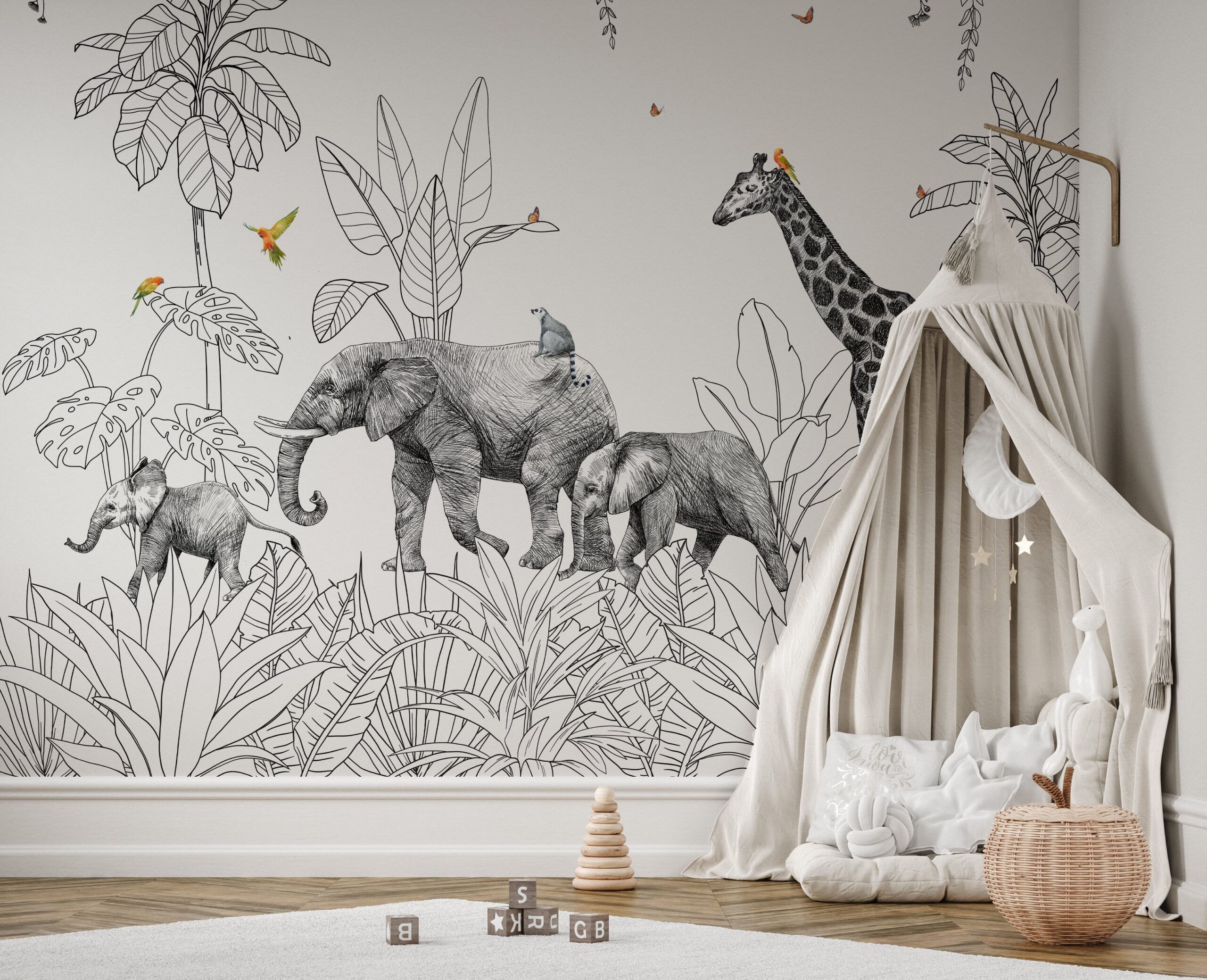 Zanurz się w niezwykły świat dzikiej natury dzięki fototapecie „Dżunglowa Harmonia”. Ta urokliwa ilustracja przedstawia wesołe zwierzęta, takie jak słonie, żyrafy i małpki, które w harmonii przemierzają tropikalną dżunglę pełną bujnych roślin i kolorowych ptaków. Połączenie delikatnych rysunków w czerni i bieli z akcentami intensywnych barw tworzy w przestrzeni ciepłą, pełną radości atmosferę.
