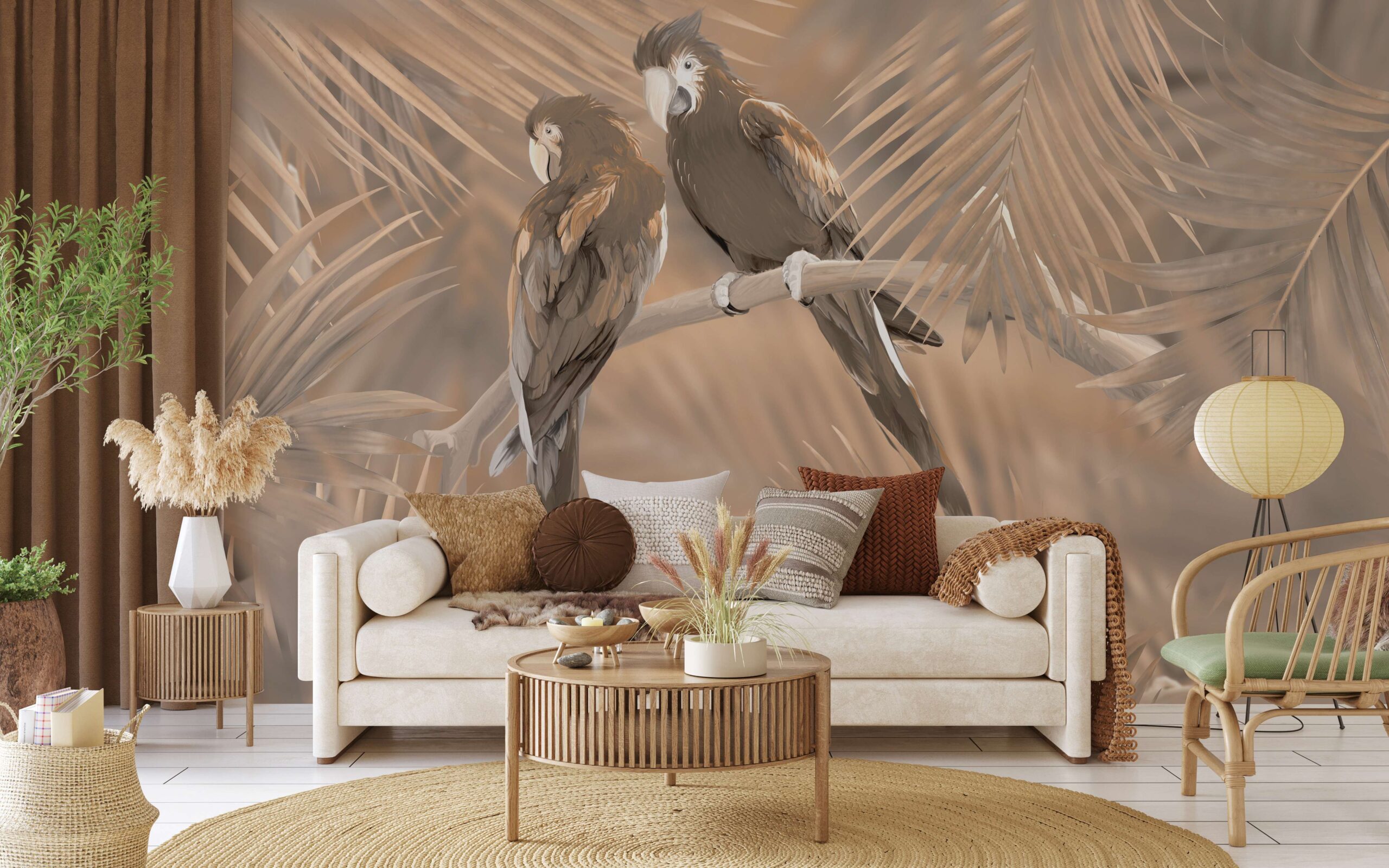 Wprowadź do swojego wnętrza nutę egzotyki i spokoju dzięki fototapecie „Egzotyczne Spotkanie”. Ilustracja dwóch papug siedzących wśród delikatnych palmowych liści tworzy kompozycję pełną naturalnego wdzięku i harmonii. Stonowana, beżowo-brązowa kolorystyka nadaje całości szlachetnego, wyciszającego charakteru.