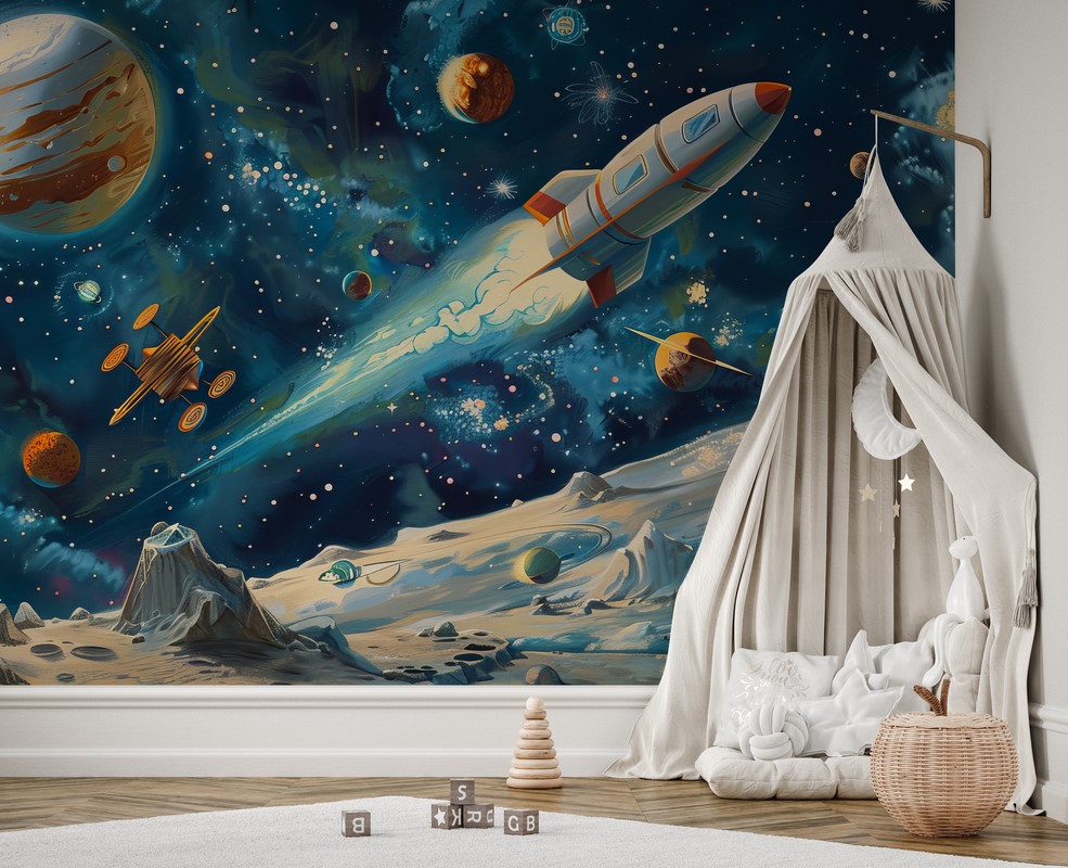Fototapeta „Kosmiczna podróż” to dekoracja, która zabiera wnętrze w bajkową wizję wszechświata — z rakietą unoszącą się pośród planet, gwiazd i mgławic w intensywnych barwach nocnego nieba. Obraz pełen głębokiej czerni, ultramaryny, błękitów oraz innych akcentów tworzy przestrzenną kompozycję, idealną do pokoju młodzieżowego, pokoju kreatywnego lub pokoju dziecka. Styl ilustracji oscyluje między futurystycznym science‑fiction a artystyczną wizją kosmosu, co sprawia, że tapeta emanuje energią, inspiracją i uczuciem nieskończonego potencjału.