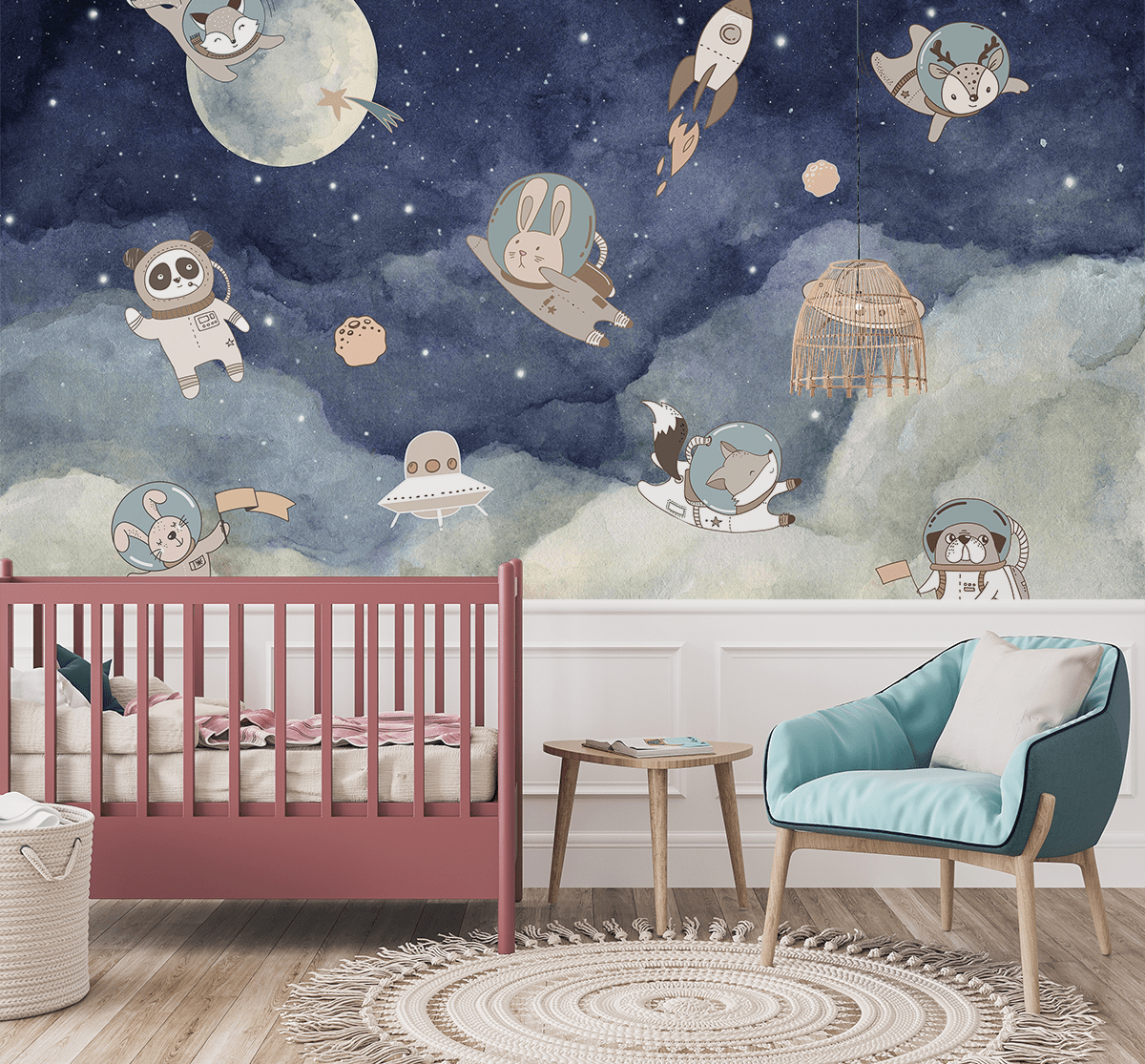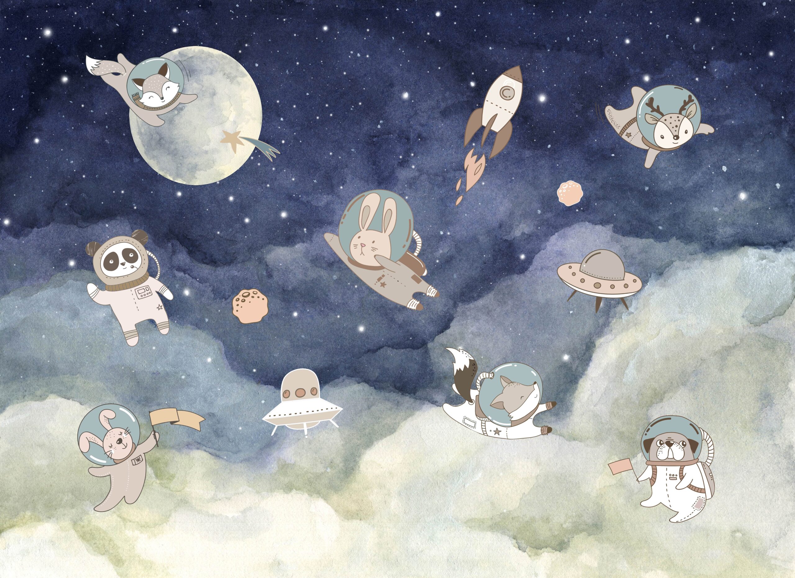 Fototapeta „Kosmiczne Zwierzątka” – magiczna podróż w kosmos pełna uroczych zwierzątek i dziecięcej wyobraźni
