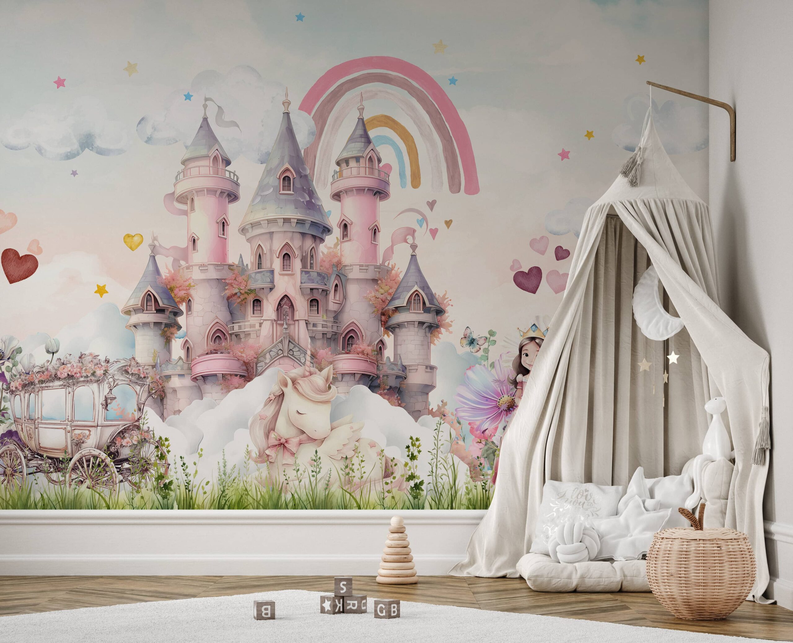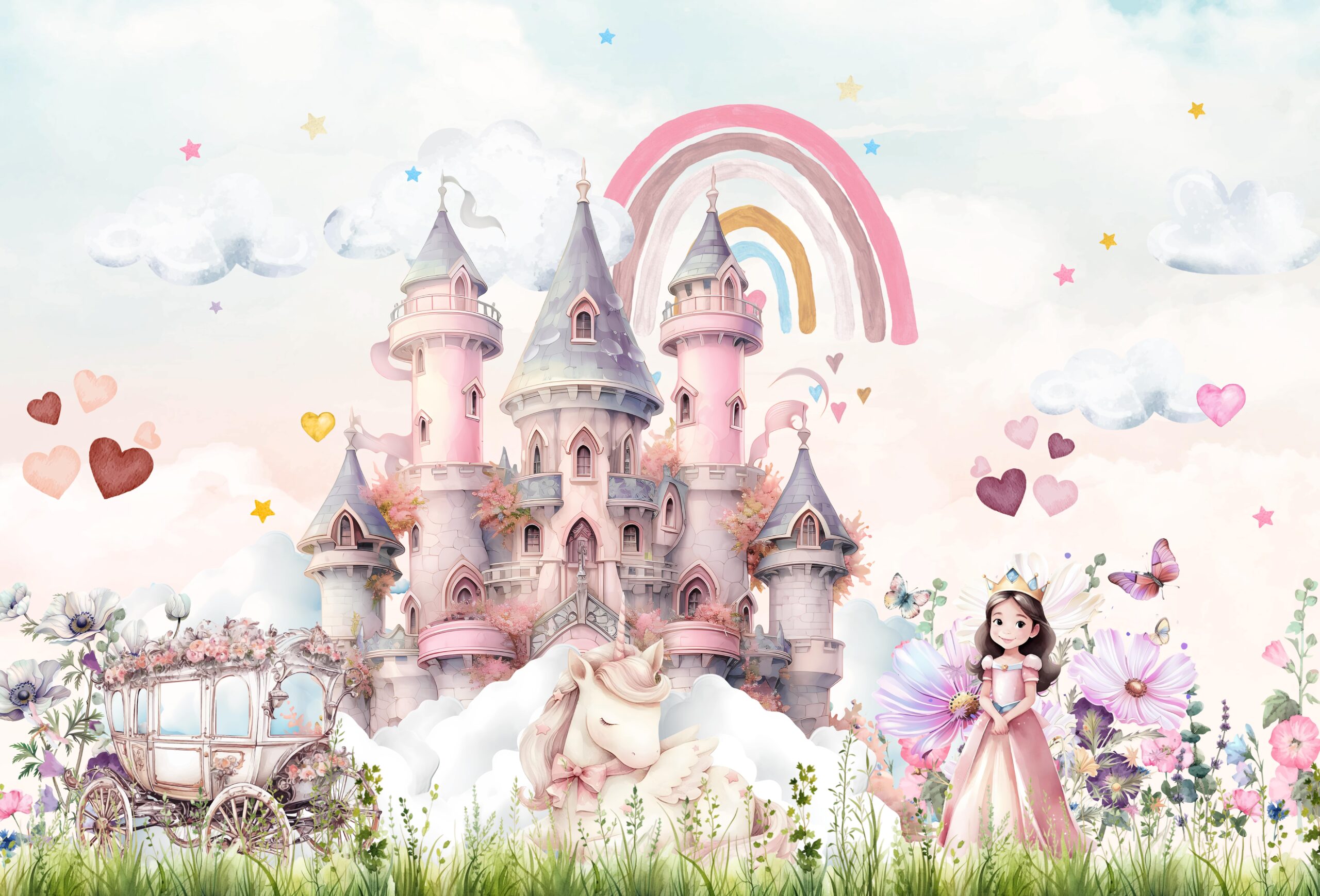 Zamień pokój dziecka w zaczarowaną krainę dzięki fototapecie „Kraina Różanej Tęczy”. Ten uroczy, pastelowy motyw przenosi najmłodszych w świat pełen marzeń – z różowym zamkiem, śpiącym jednorożcem, tęczą i księżniczką w otoczeniu kwiatów. Każdy detal został stworzony z myślą o delikatności dziecięcej wyobraźni i bajkowym nastroju.