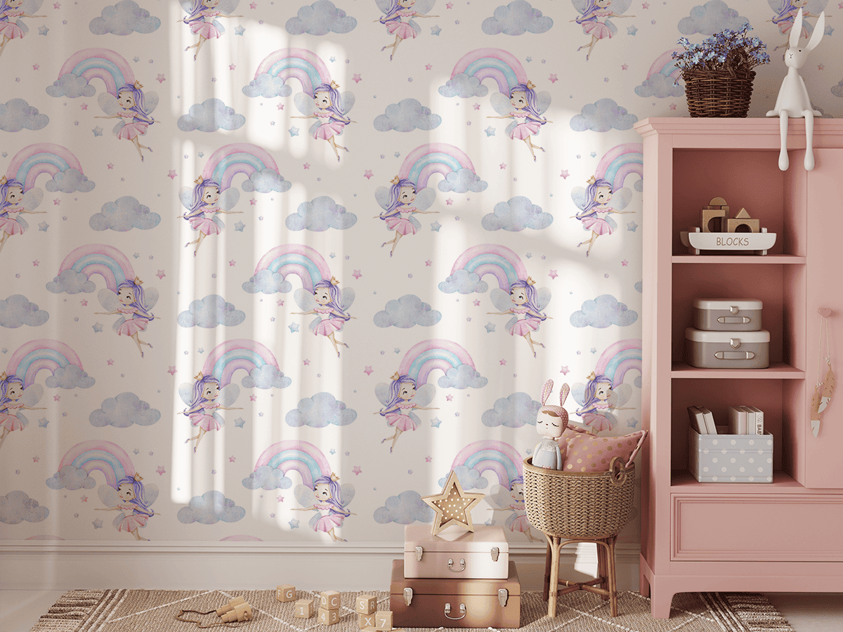 Wprowadź do pokoju swojego dziecka wyjątkowy, pełen uroku klimat dzięki fototapecie „Księżniczka Chmur”. Ten delikatny wzór z pastelowymi tęczami, chmurkami i uroczymi wróżkami w różowych sukienkach tworzy atmosferę pełną ciepła, magii i dziecięcej radości. Idealna do aranżacji sypialni lub pokoju zabaw, gdzie wyobraźnia i marzenia mogą rozkwitać każdego dnia.