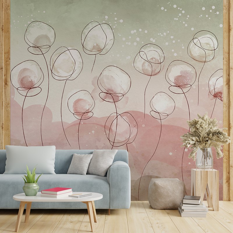 Fototapeta „Kwiaty w Płynnych Liniach” łączy w sobie delikatne motywy kwiatowe z dynamicznymi, płynnymi liniami, tworząc nowoczesną i elegancką kompozycję. Subtelne kwiaty wprowadzają do wnętrza spokój, harmonię i naturalny akcent, a płynne linie dodają wyrafinowanego, artystycznego charakteru.