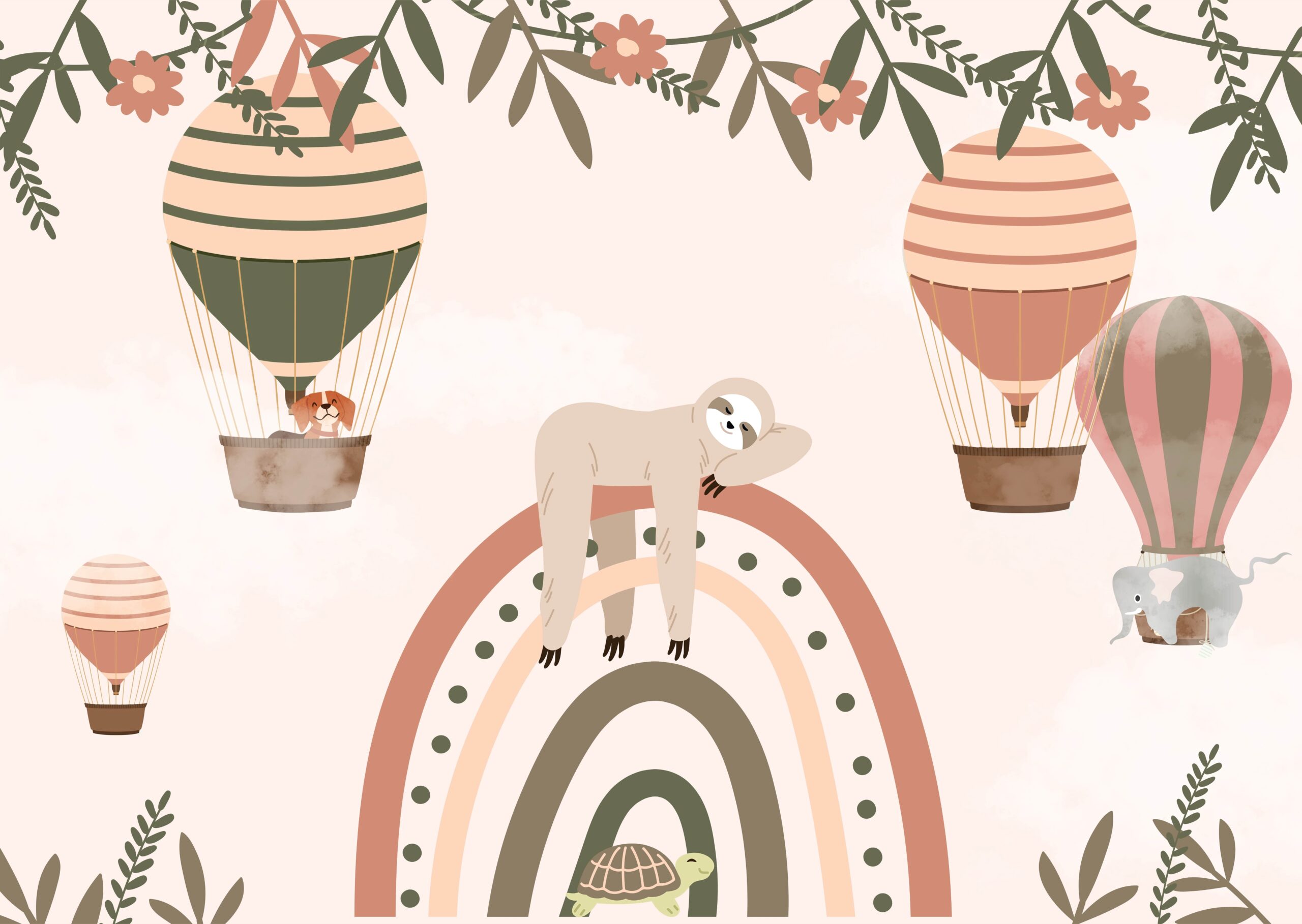 Zamień pokój dziecka w magiczną krainę dzięki fototapecie „Leniwiec na Tęczy”. Ta urocza ilustracja przedstawia spokojnego leniwca odpoczywającego na kolorowej tęczy w towarzystwie balonów, zwierzątek i delikatnych, pastelowych chmur. Subtelna, ciepła kolorystyka i przyjazne motywy tworzą idealne tło do zabawy, snu i marzeń.