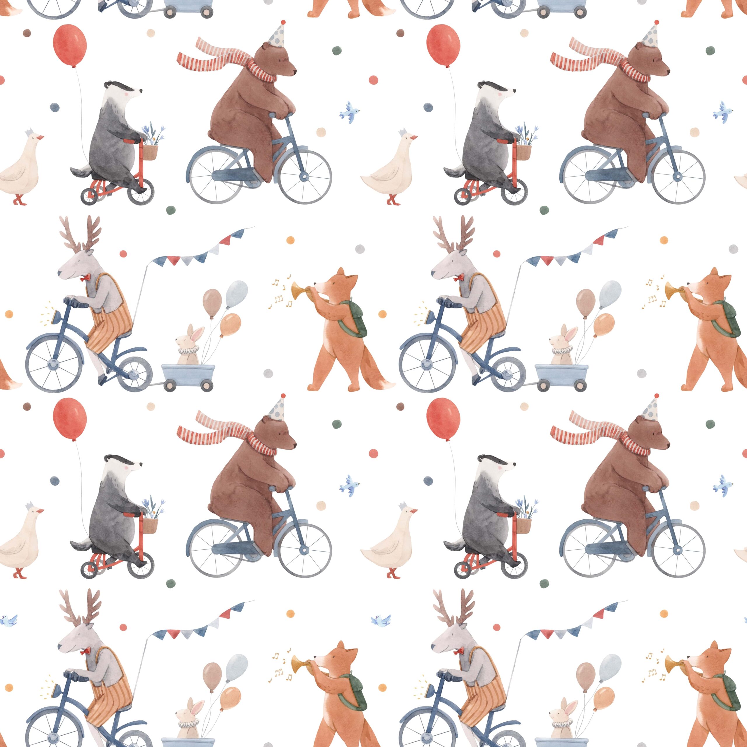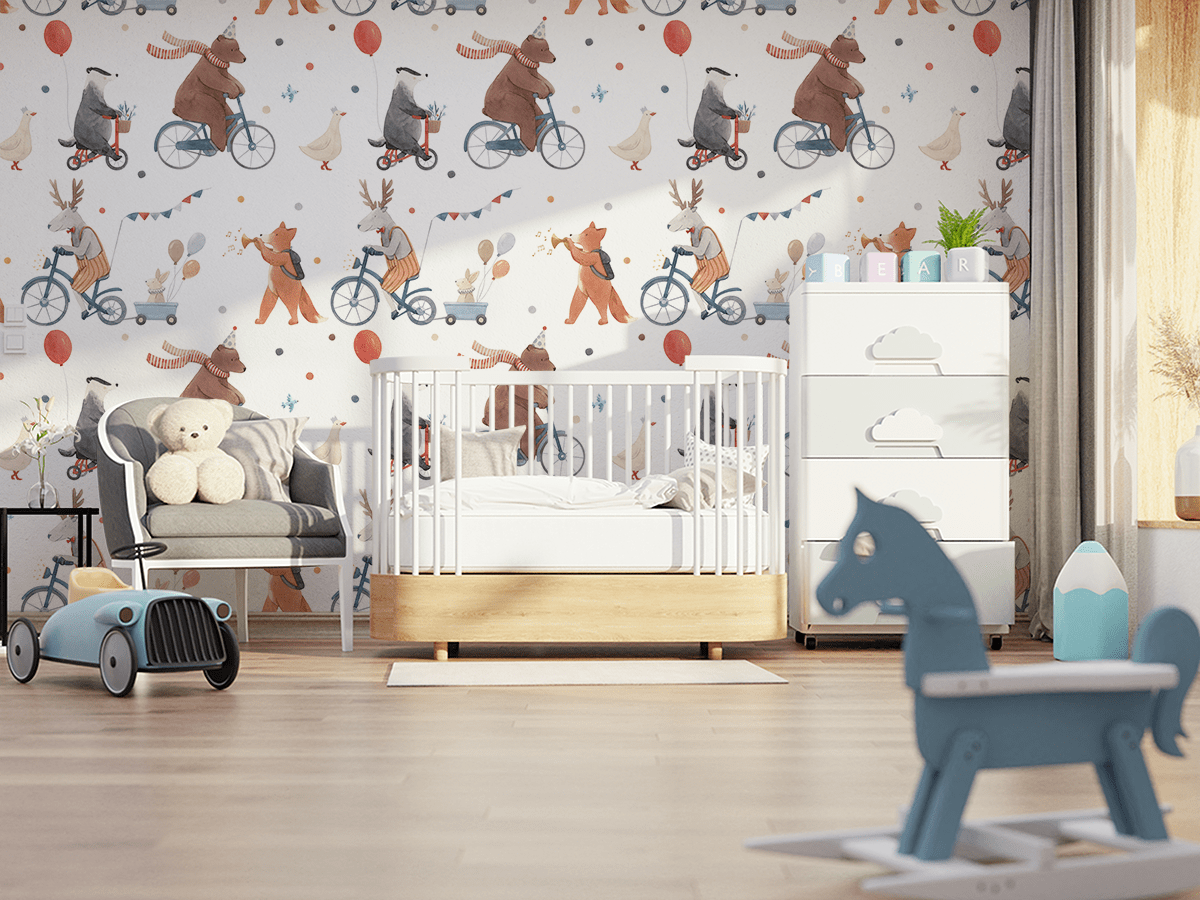 Zamień pokój dziecka w magiczne miejsce dzięki fototapecie „Leśna Parada”. Ten pełen uroku wzór przedstawia radosnych, leśnych przyjaciół – misia, lisa, jelenia, borsuka i królika – którzy wspólnie bawią się na rowerach, hulajnogach i w rytmie muzyki. Delikatna, akwarelowa kolorystyka i przyjazne postacie wprowadzają do wnętrza ciepło, radość i atmosferę beztroskiej przygody.