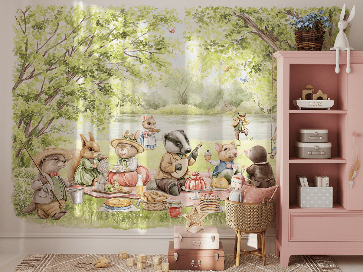 Wprowadź do pokoju swojego dziecka niezwykły świat dzięki fototapecie „Leśne przyjęcie przy jeziorze”. Ten uroczy, pełen szczegółów obraz przedstawia wesołe zwierzątka bawiące się, jedzące i spędzające czas razem na leśnym pikniku nad jeziorem. Delikatne kolory i ciepły klimat tworzą przyjazną i inspirującą przestrzeń do zabawy i nauki.