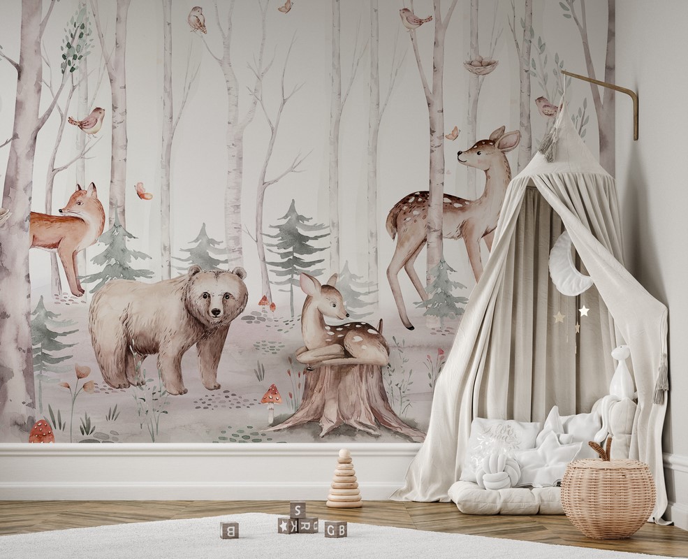 Fototapeta „Leśne zwierzęta w delikatnym krajobrazie” prezentuje uroczy, spokojny świat natury, idealny do pokoju dziecięcego. Grafika ukazuje różnorodne zwierzęta leśne — sarny, niedźwiedzie, lisy, sowy — w harmonijnej, pastelowej scenerii lasu, która emanuje delikatnością, ciepłem i spokojem. Dzięki subtelnym barwom i starannie wykonanym ilustracjom, tapeta wprowadza do wnętrza atmosferę bajkowego lasu i naturalnej elegancji.