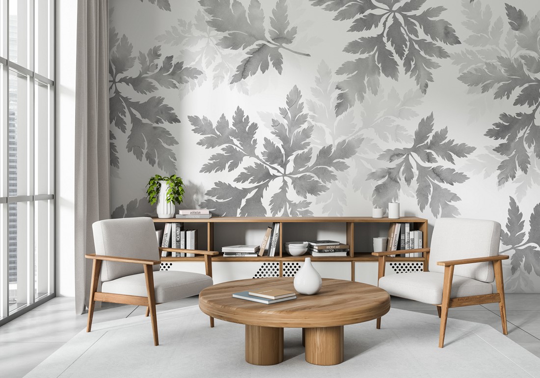 Grafika charakteryzuje się subtelnością i wyrafinowaną spokojnością: liście oglądane jak przez mgłę, delikatnie układające się w spokojny wzór, który wprowadza optyczną głębię i elegancję. Dzięki stonowanej kolorystyce fototapeta pasuje zarówno do przestrzeni mieszkalnych — salonu, sypialni — jak i do przestrzeni biurowych, gdzie dominują neutralne tło i styl minimalistyczny.