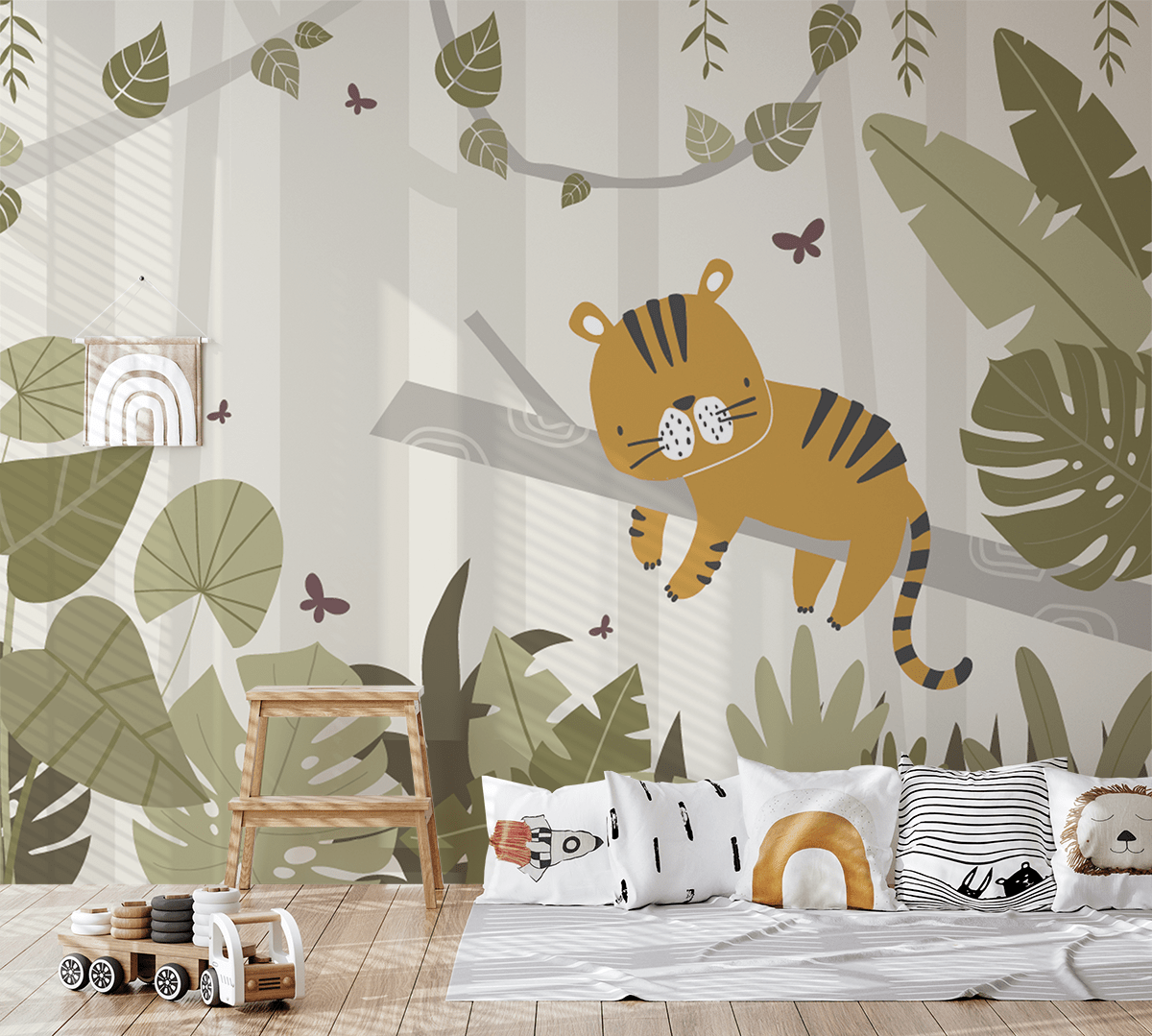 Wprowadź do pokoju swojego dziecka magiczny świat dzięki fototapecie „Mały Tygrysek w Zielonym Lesie”. Ten uroczy, kolorowy obrazek przedstawia małego tygryska odpoczywającego na gałęzi w otoczeniu zielonych liści i motylków, tworząc przyjazną i spokojną atmosferę pełną przygody i zabawy. Delikatne barwy i sympatyczny wzór sprawiają, że fototapeta doskonale pasuje do dziecięcych pokoi, przedszkoli czy kącików zabaw.