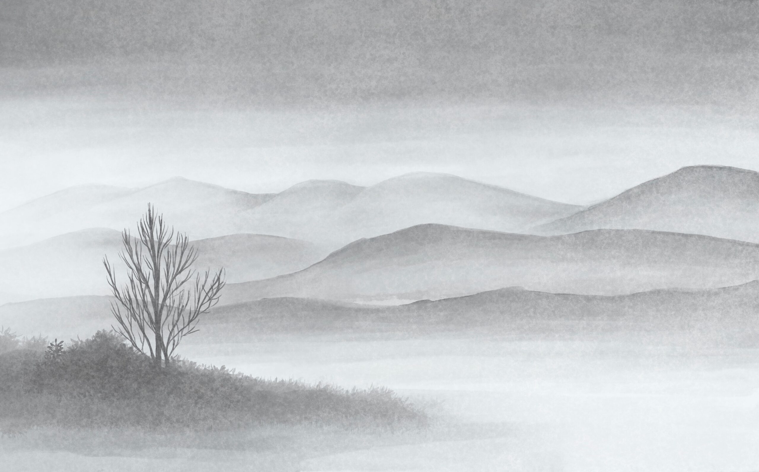 Wprowadź do swojego wnętrza atmosferę ciszy i spokoju dzięki fototapecie „Mglisty Horyzont”. Ten nastrojowy pejzaż w odcieniach szarości przedstawia łagodne wzgórza skryte w porannej mgle oraz samotne drzewo, tworząc niezwykle harmonijną i wyciszającą kompozycję.