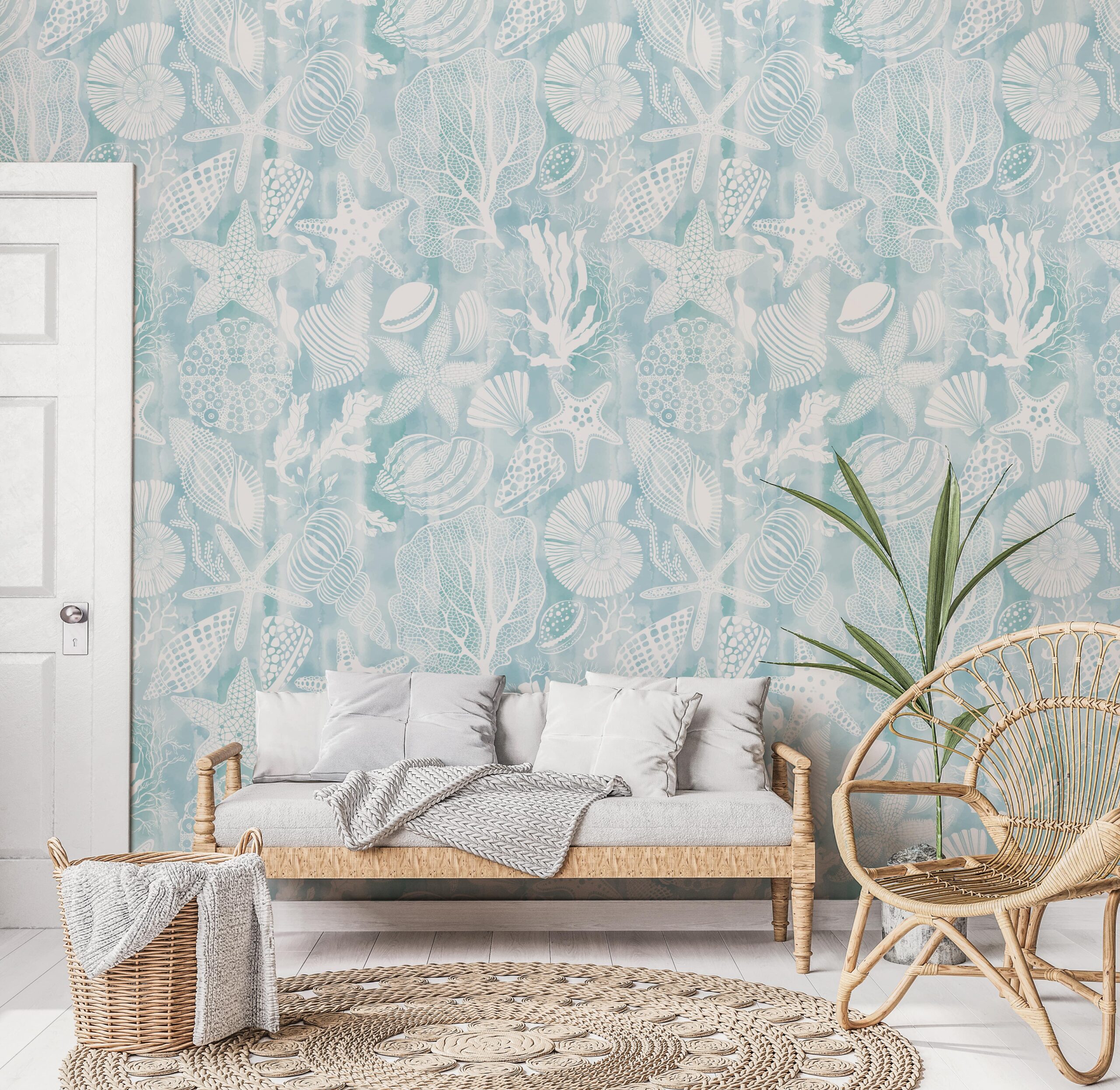 Wprowadź do swojego wnętrza niepowtarzalny klimat dzięki fototapecie „Morska Tkanina”. Delikatny wzór muszli, korali i gwiazd morski przywołuje uczucie relaksu i odświeżenia. Subtelne, białe akcenty na tle miękkiego błękitu tworzą atmosferę jakbyś znajdował się pod wodą, otoczony spokojem morza.