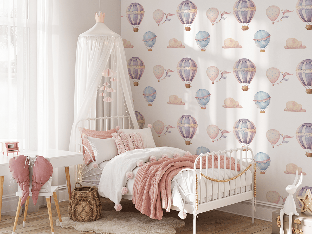 Zamień pokój dziecka w magiczną krainę dzięki fototapecie „Pastelowe Podniebne Sny”. Ten delikatny wzór z balonami na gorące powietrze i miękkimi chmurkami, utrzymany w pastelowych odcieniach różu, fioletu i błękitu, tworzy przytulną i pełną marzeń przestrzeń. Akwarelowe ilustracje przenoszą najmłodszych w podniebną podróż pełną spokoju, radości i wyobraźni.