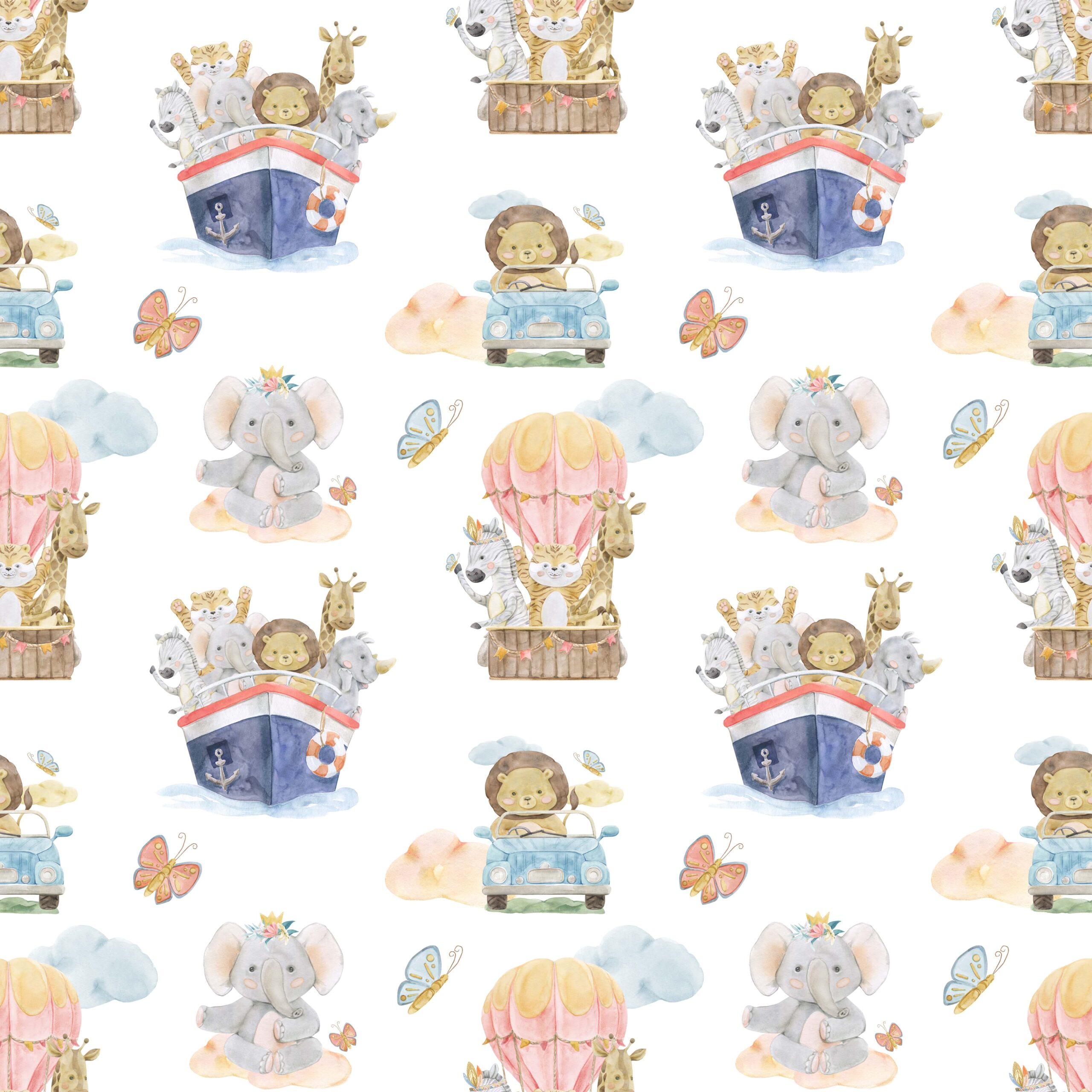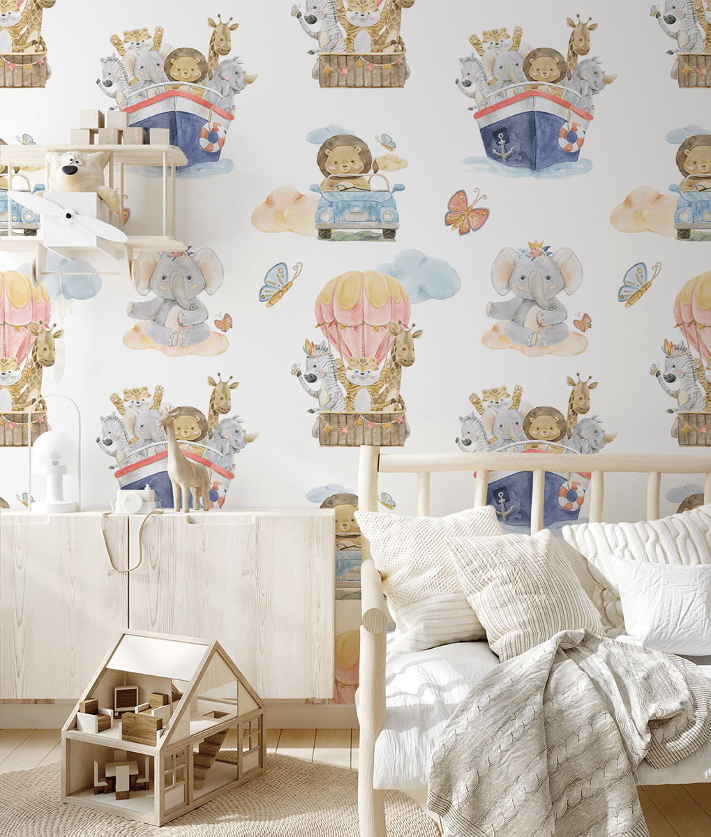 Zamień pokój Twojego malucha w magiczną krainę wyobraźni dzięki fototapecie „Podróże Małych Odkrywców”. Ten uroczy, akwarelowy wzór z sympatycznymi zwierzątkami w balonie, samochodzie i statku przenosi najmłodszych w świat niekończących się przygód, inspirując do zabawy i marzeń.