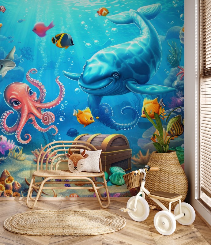Fototapeta „Podwodna Przygoda z Morskimi Mieszkańcami” – bajkowy świat, morska magia i radosna dekoracja dziecięcego pokoju
