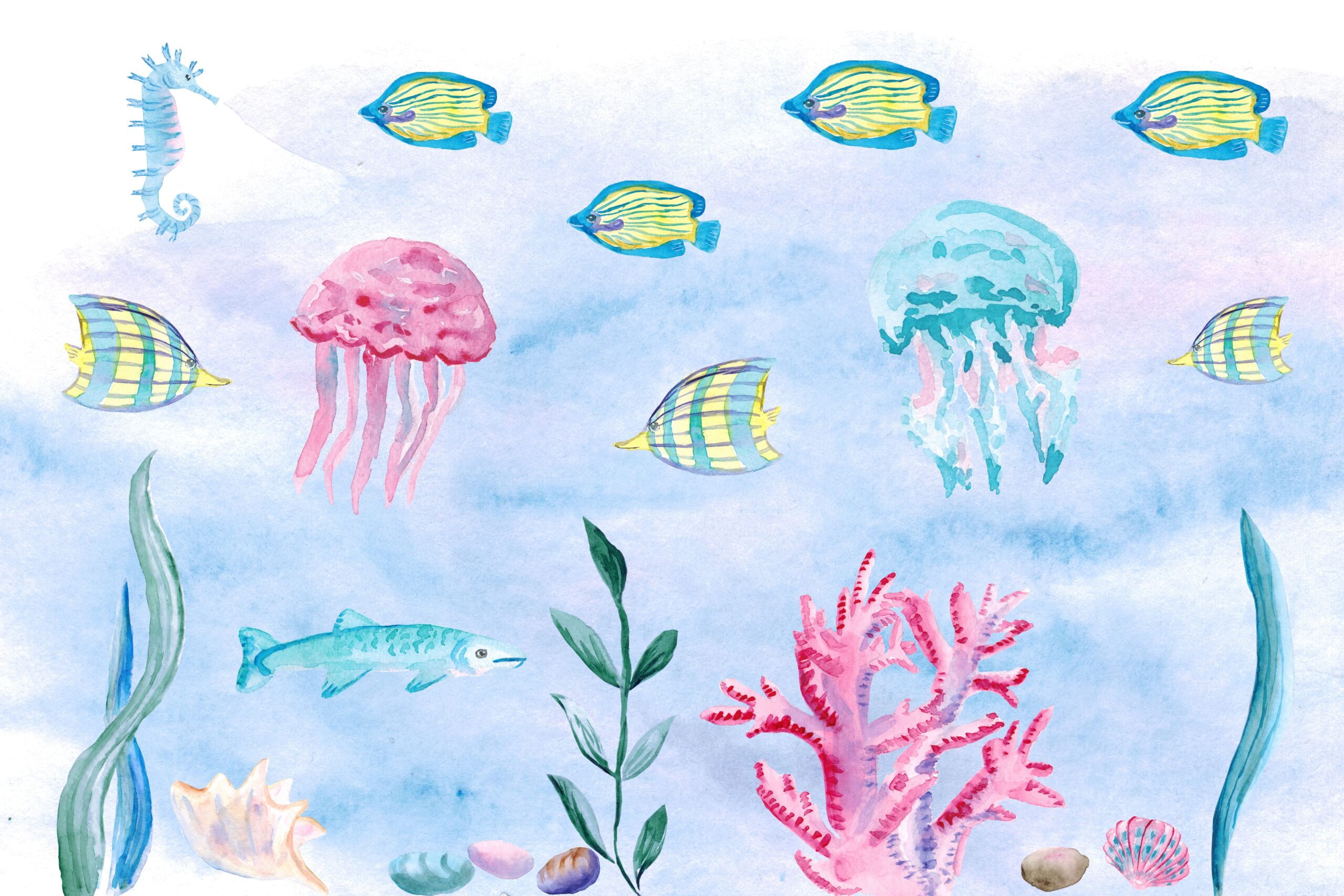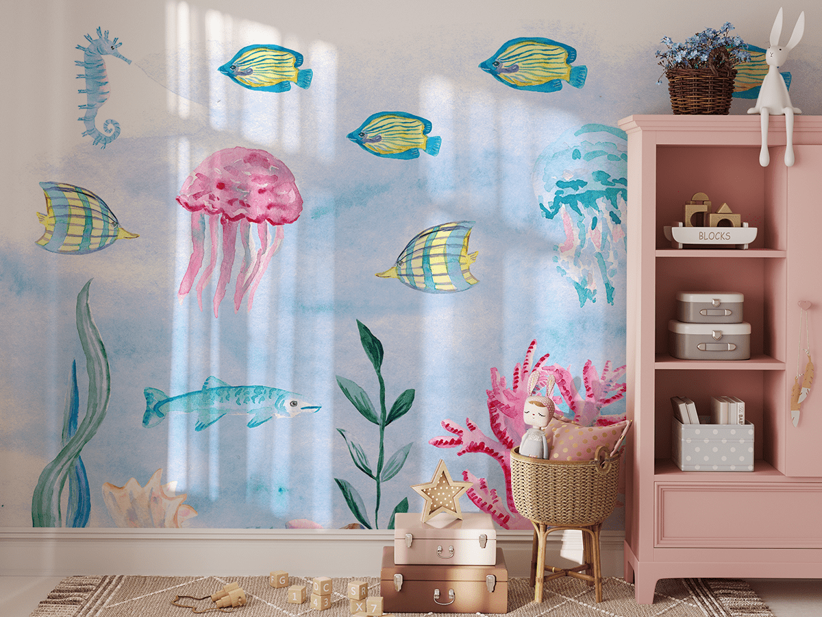 Zanurz się w magiczny świat oceanu z fototapetą „Podwodna Symfonia”! Ta pełna barw, ręcznie malowana ilustracja przenosi najmłodszych w podwodną krainę pełną wesołych rybek, meduz, koników morskich i koralowców. Delikatne akwarelowe tony oraz urocze morskie stworzenia pobudzają wyobraźnię i wprowadzają do pokoju dziecka atmosferę beztroskiej, morskiej przygody.