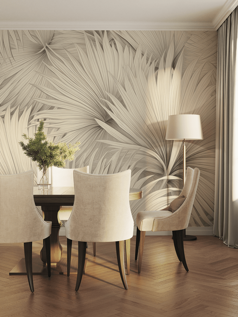 Odkryj subtelne piękno natury dzięki fototapecie „Pustynny Wiatr”. Ten eteryczny, inspirowany organicznymi formami wzór przywołuje na myśl delikatny ruch suchych liści poruszanych przez pustynną bryzę. Jasna, stonowana paleta barw i finezyjna linia wprowadzają do wnętrza uczucie przestrzeni, lekkości i spokoju.