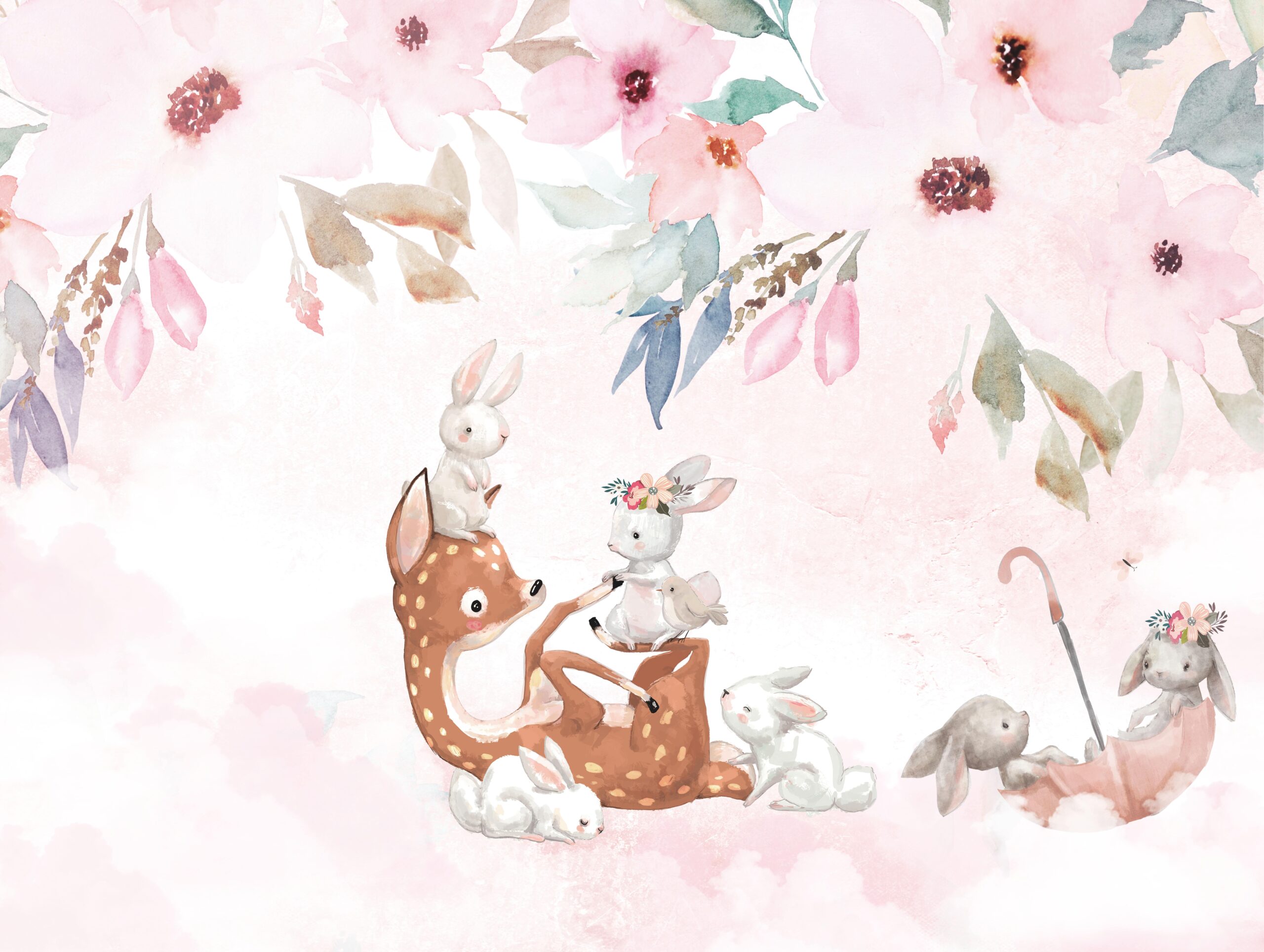 Zamień pokój dziecka w magiczne miejsce pełne radości i ciepła dzięki fototapecie „Różowy Zakątek Przyjaźni”. Ten uroczy, pastelowy wzór przedstawia przyjaznego jelonka, wesołe króliczki i delikatne kwiaty, tworząc atmosferę beztroskiej zabawy i bliskości natury. Subtelna kolorystyka w odcieniach różu i kremu wprowadza spokój i harmonię, idealną do wypoczynku i marzeń.