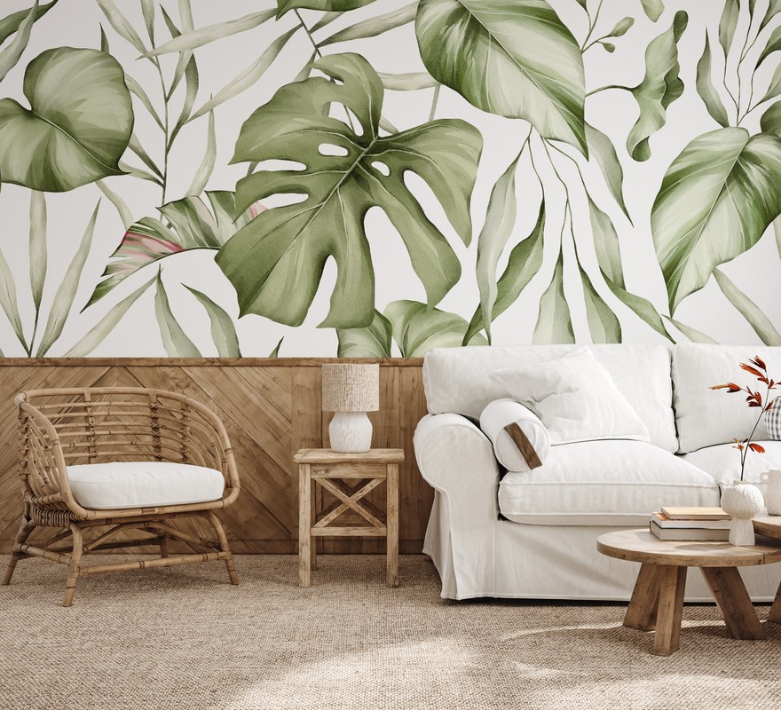- DO KUCHNI, Do pokoju, DO SALONU, DO ŁAZIENKI, Fototapety, Kolory, Odcienie Szarości, Styl, TROPIKALNE LIŚCIE, Tropikalny