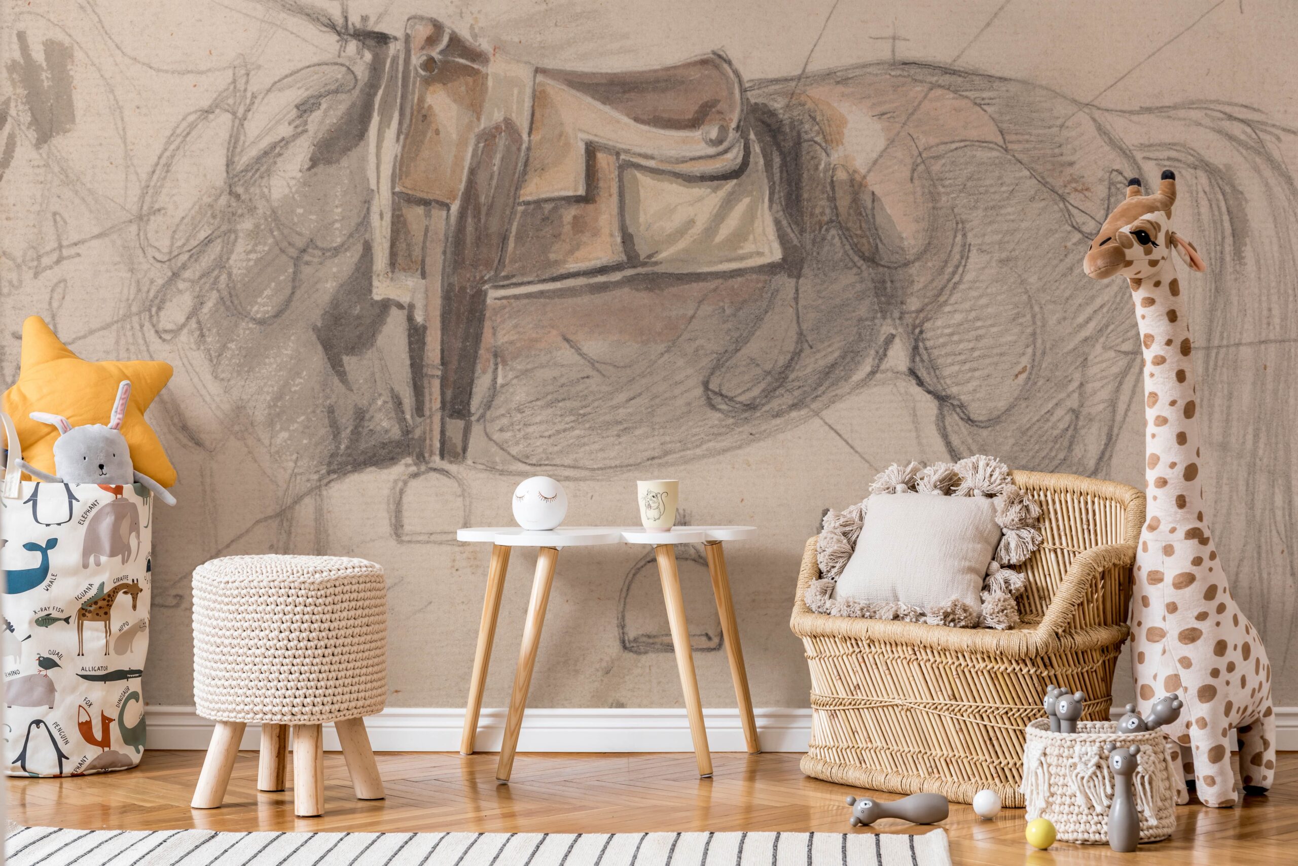 Przenieś swoje dzieci do świata wyobraźni z fototapetą „Szkic z Siodłem”. Ten ręcznie wykonany rysunek konia z siodłem pobudza kreatywność i rozwija zamiłowanie do przyrody oraz zwierząt. Delikatne linie i miękka kolorystyka tworzą przyjazną, spokojną atmosferę, idealną dla małych odkrywców.
