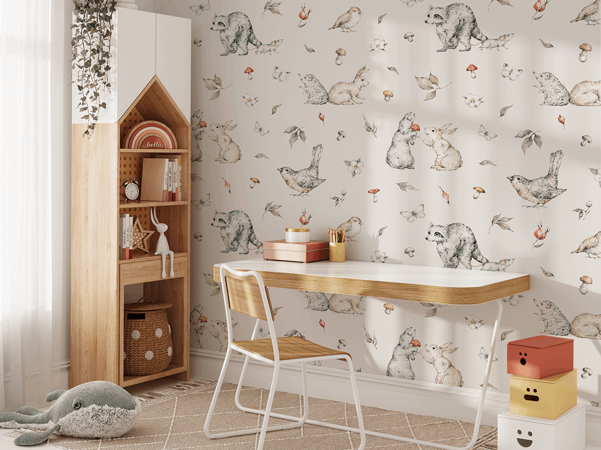 Zapraszamy najmłodszych do odkrywania natury z fototapetą „Tajemnice Polany”. Ten uroczy wzór pełen jest leśnych zwierzątek, kwiatów i delikatnych liści, które wprowadzają do pokoju dziecięcego ciepłą, przyjazną atmosferę pełną zabawy i ciekawości. Pastelowe kolory i miękkie linie sprawiają, że przestrzeń staje się przytulna i inspirująca.