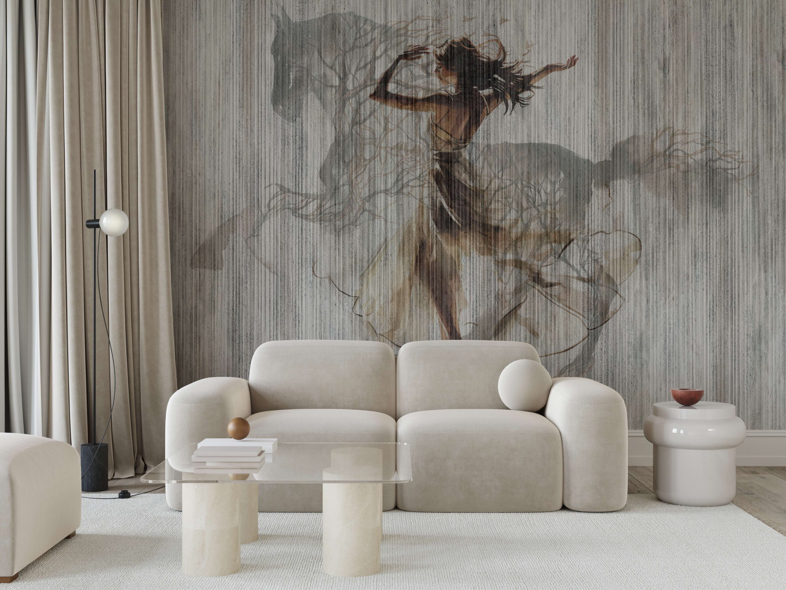 Wprowadź do swojego wnętrza magię subtelnej sztuki dzięki fototapecie „Taniec Natury”. Ta wyjątkowa kompozycja łączy kobiecą sylwetkę w tanecznym uniesieniu z delikatnym konturem konia i organicznymi motywami przypominającymi gałęzie drzew. Całość utrzymana jest w stonowanej, eterycznej kolorystyce, która wprowadza do przestrzeni spokój, poezję i artystyczną głębię.