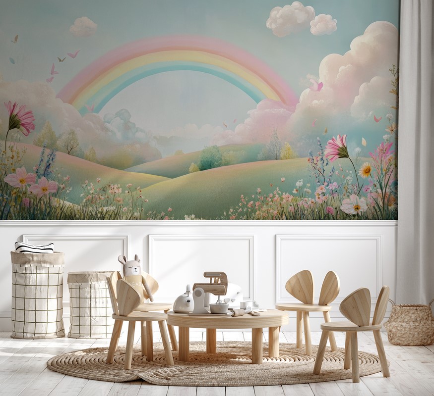 Fototapeta „Tęczowy raj na łące” to malownicza kompozycja, która przenosi wnętrze w serce kwitnącej łąki pełnej barw i lekkości. Misternie zestawione w pastelach kwiaty – od jasnoróżowych po fioletowe i kremowe – tworzą żywy, unikalny mural, przypominający impresjonistyczny ogród. Tło o pudrowo-zielonym odcieniu wzmacnia wrażenie naturalności, świeżości i przestrzeni. Idealna do pokoju dziecięcego — wprowadza atmosferę spokoju, artystycznego wdzięku i subtelnej energii natury. To propozycja dla osób, które cenią dekoracje inspirowane florą, malarską estetyką i wnętrza pełne delikatnej harmonii.