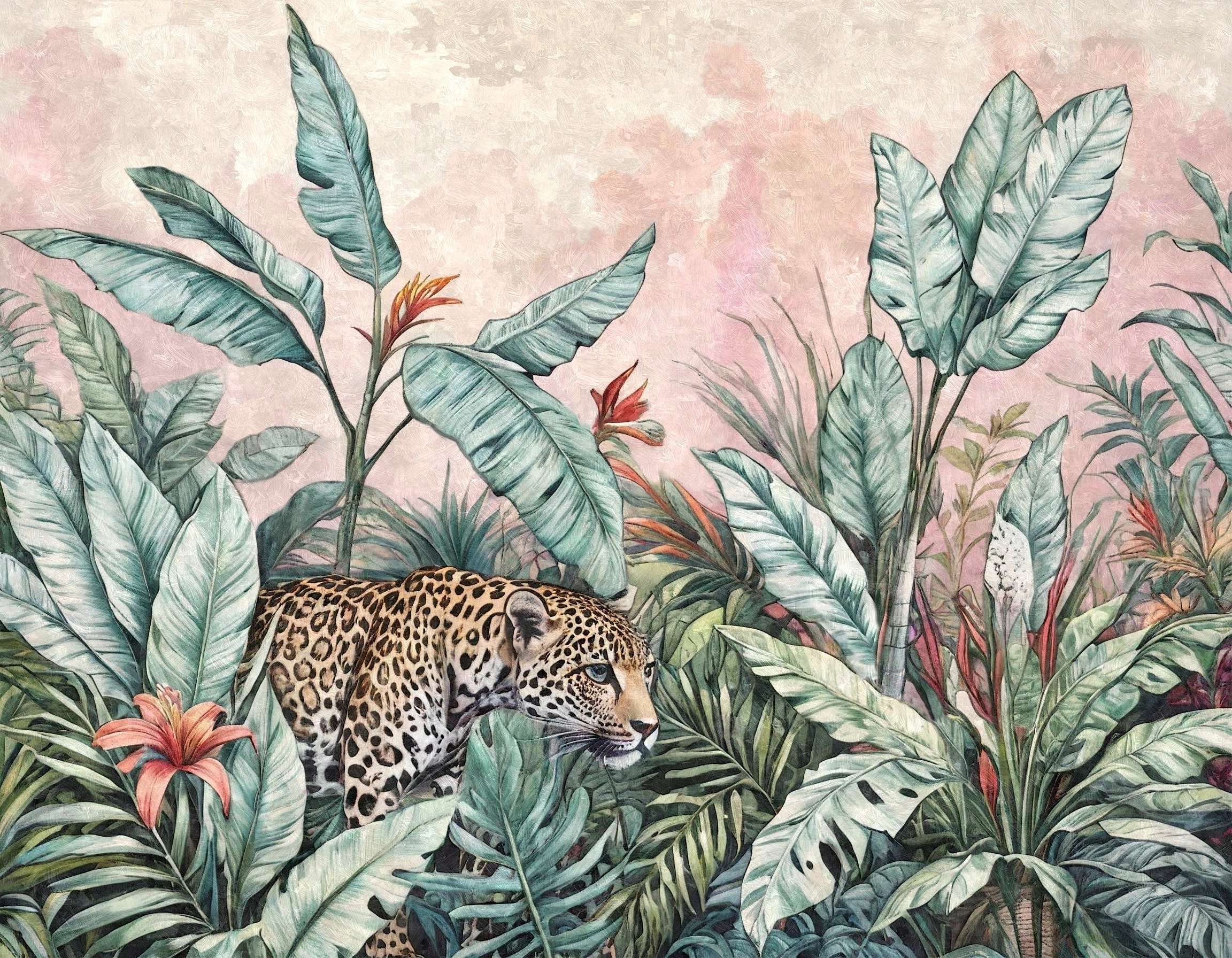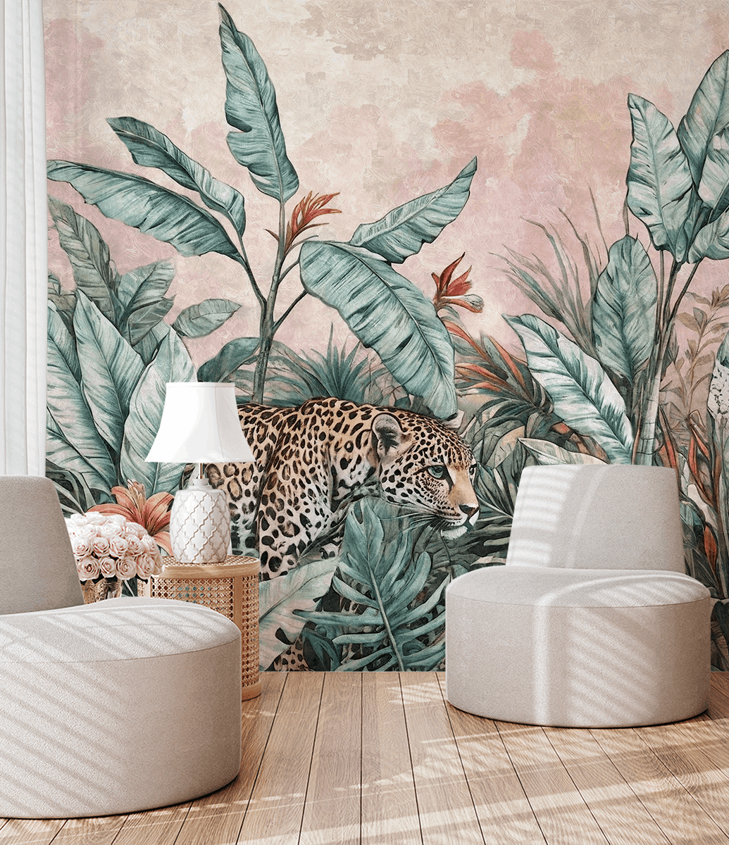 Wprowadź do swojego domu zmysłowy rytm tropikalnej dżungli dzięki fototapecie „Tropikalna Czujność”. To wyjątkowe połączenie bujnej roślinności i majestatycznej sylwetki lamparta tworzy kompozycję pełną napięcia, harmonii i naturalnego piękna. Ręcznie malowane liście w odcieniach zieleni i błękitu, przełamane subtelnym różem tła, budują atmosferę dzikiej, ale zarazem wyrafinowanej przestrzeni.
