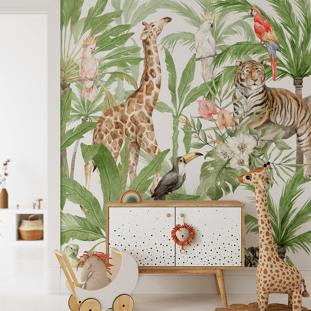 Zanurz się w magiczny świat tropików dzięki fototapecie „Tropikalna Odyseja”. Pełna kolorów i niezwykłych zwierząt, ta fototapeta przenosi Cię do dżungli, w której królują egzotyczne ptaki, wspaniałe rośliny i dzikie zwierzęta, takie jak zebra, żyrafa czy tygrys. Każdy detal tej wyjątkowej dekoracji tętni życiem, tworząc radosną atmosferę pełną przygód i odkryć.