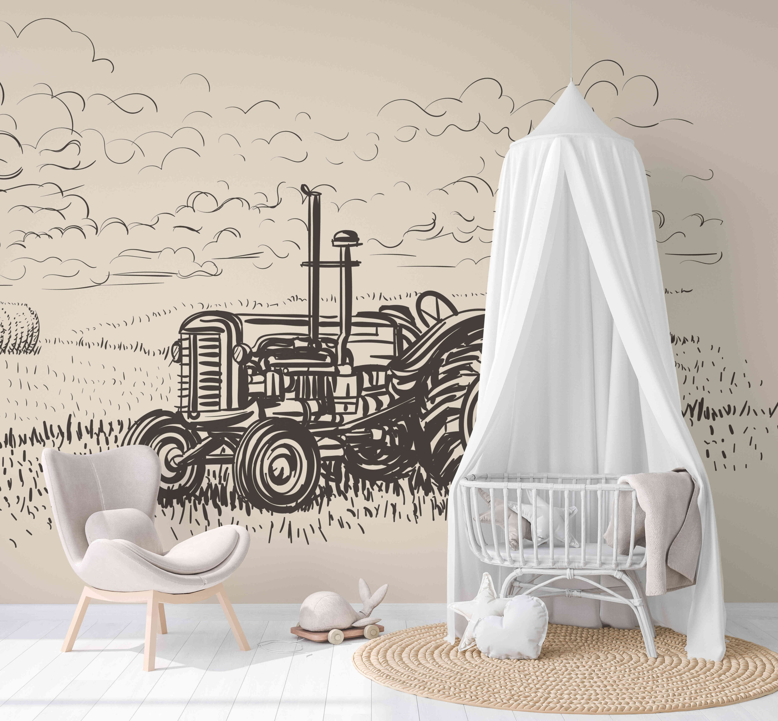 Wprowadź do swojego domu niepowtarzalny klimat dzięki fototapecie „Wiejska Nostalgia”. Ten misternie wykonany szkic traktora na tle pola z belami siana przywołuje wspomnienia prostoty i harmonii wiejskiego życia, nadając przestrzeni ciepłą i przytulną atmosferę. Subtelna, monochromatyczna stylistyka doskonale komponuje się zarówno z klasycznymi, jak i nowoczesnymi aranżacjami wnętrz.