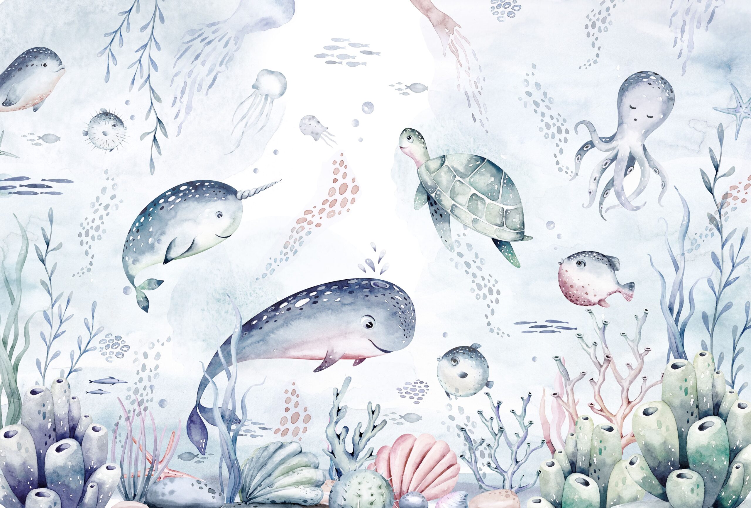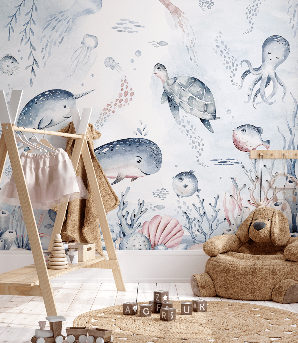 Zamień pokój swojego dziecka w zaczarowaną krainę dzięki fototapecie „Wielka Morska Rodzina”. Ten uroczy, ręcznie malowany wzór przedstawia sympatycznych mieszkańców oceanu – od roześmianego narwala, przez ciekawską ośmiornicę, aż po wesołe rybki i spokojnego żółwia. Całość utrzymana jest w delikatnych pastelowych kolorach, które wprowadzają do wnętrza harmonię, spokój i dziecięcą radość.