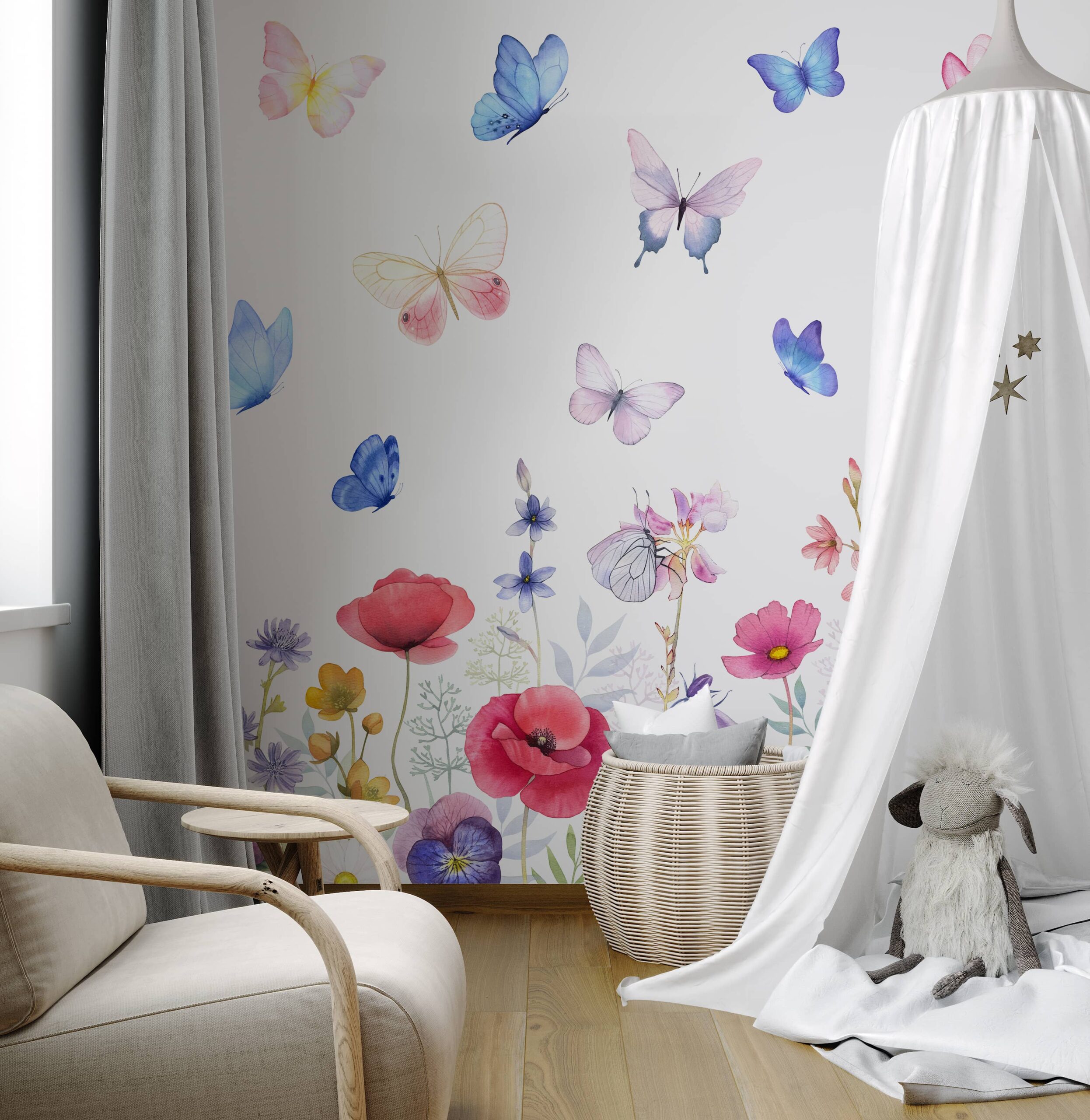 Fototapeta „Wiosenna Symfonia” – radosna i kolorowa przestrzeń pełna motyli i kwiatów, która wprowadza do pokoju dziecięcą magię i świeżość.