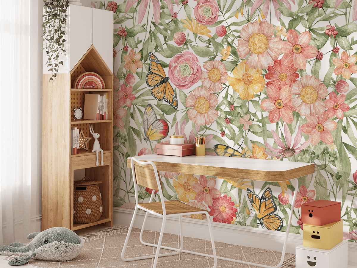 Zanurz się w świecie pełnym kwiatów i kolorów dzięki fototapecie „Wiosenne Skrzydła”. Ten zachwycający, delikatny wzór z motywami kwiatów i motyli przeniesie Cię do radosnego ogrodu, gdzie każdy szczegół tętni wiosenną energią. Urocze motyle w pastelowych odcieniach, otoczone kwiatami w różnych barwach, tworzą wyjątkowy, bajkowy klimat, który rozjaśni każde wnętrze.