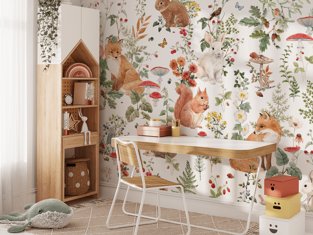 Delikatne detale i radosna kolorystyka sprawiają, że fototapeta idealnie pasuje do pokoju dziecięcego, tworząc ciepłą, przytulną i inspirującą przestrzeń do zabawy, nauki i odpoczynku. To świetny sposób, by wprowadzić do wnętrza naturalny urok lasu i przyrody.