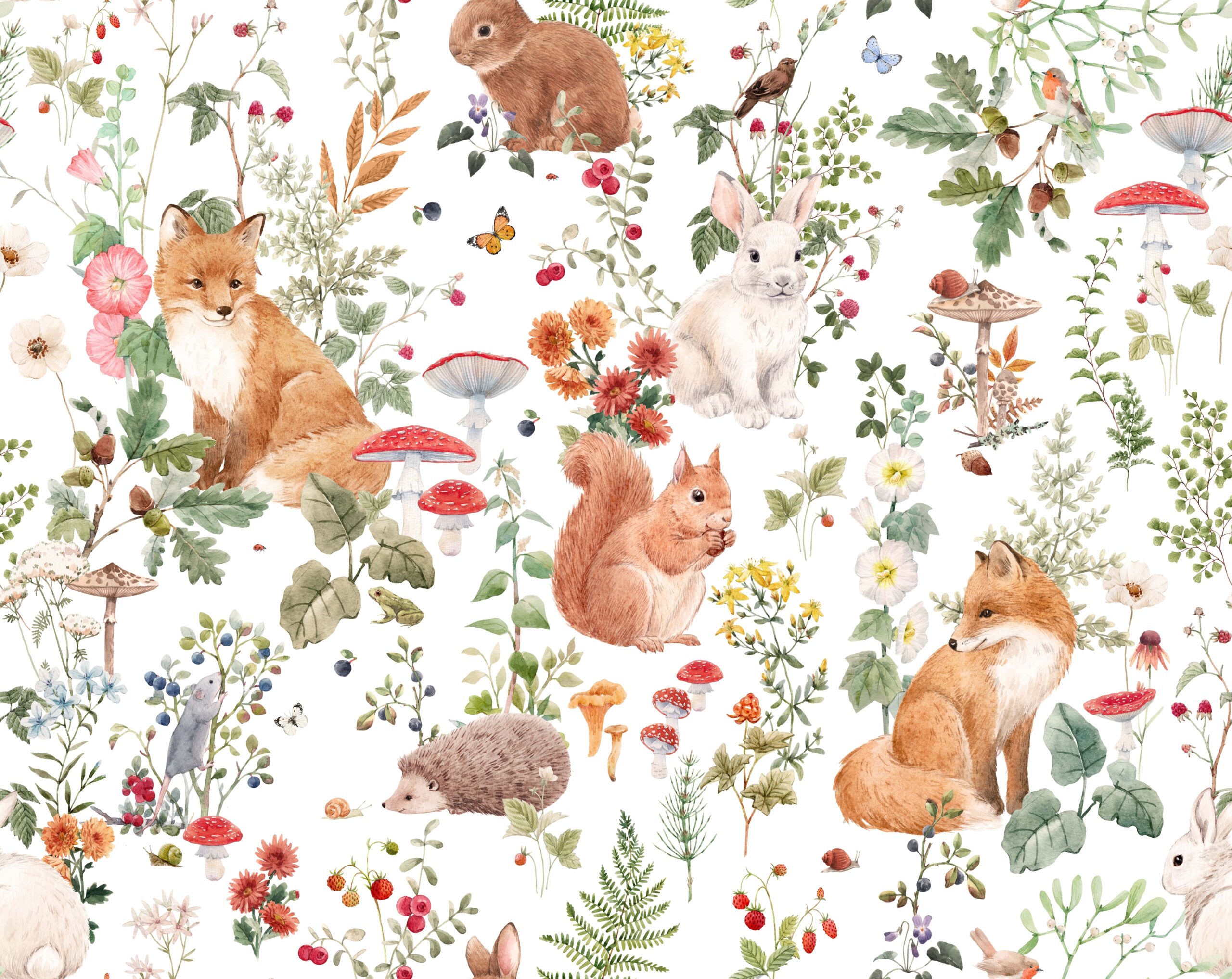 Zamień pokój swojego dziecka w zaczarowaną krainę dzięki fototapecie „Wśród Grzybów i Kwiatów”. Ten uroczy wzór pełen jest wesołych zwierzątek, kolorowych kwiatów i leśnych grzybków, które rozbudzą dziecięcą wyobraźnię i zachęcą do odkrywania świata natury.
