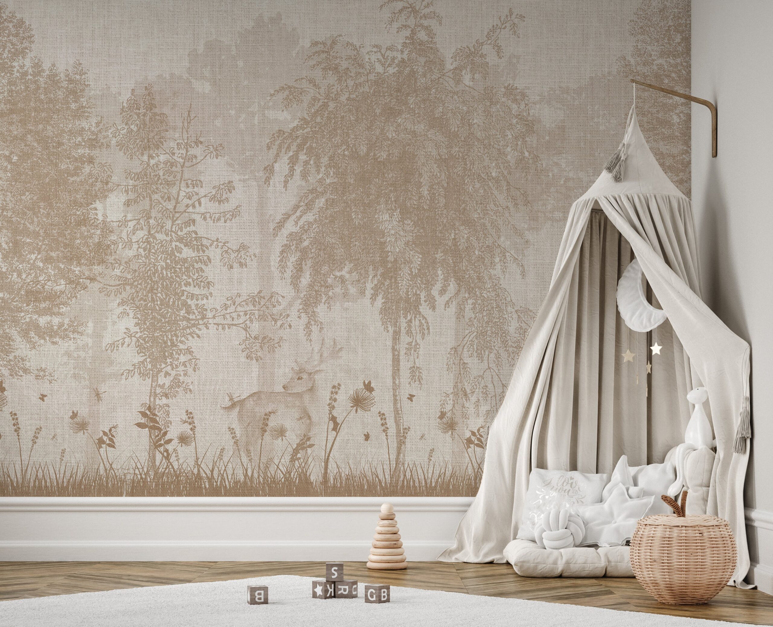 Zamień pokój dziecka w magiczny zakątek dzięki fototapecie „Wśród Jeleni”. Ten uroczy, nastrojowy wzór przenosi maluchy do zaczarowanego lasu, gdzie wśród wysokich drzew spacerują łagodne jelenie, a wokół tańczą motyle i ważki. Stonowana, ciepła kolorystyka i delikatna kreska sprawiają, że wnętrze zyskuje przytulność i spokojny, bajkowy charakter.