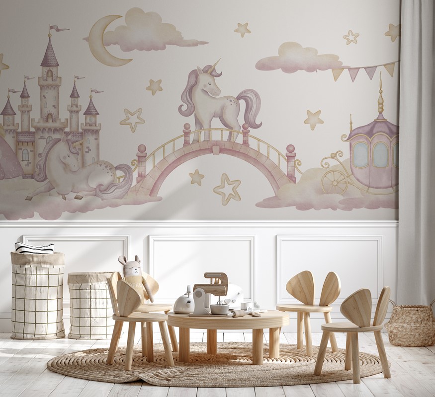 Tapeta została zaprojektowana z myślą o pokojach dziecięcych, zwłaszcza dla dziewczynek, ale dzięki eleganckiej kolorystyce z powodzeniem sprawdzi się także w przestrzeniach tematycznych, salonach lub strefach kreatywnych. Jasne, pastelowe barwy — delikatny róż i pastelowe kolory— tworzą estetycznie spójną i uspokajającą paletę, która wprowadza do wnętrza klimat baśni i delikatnej elegancji