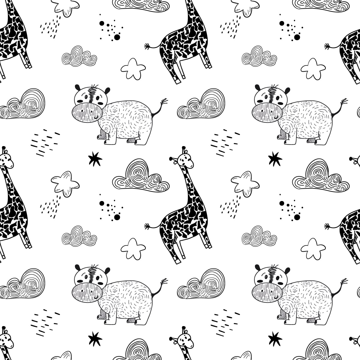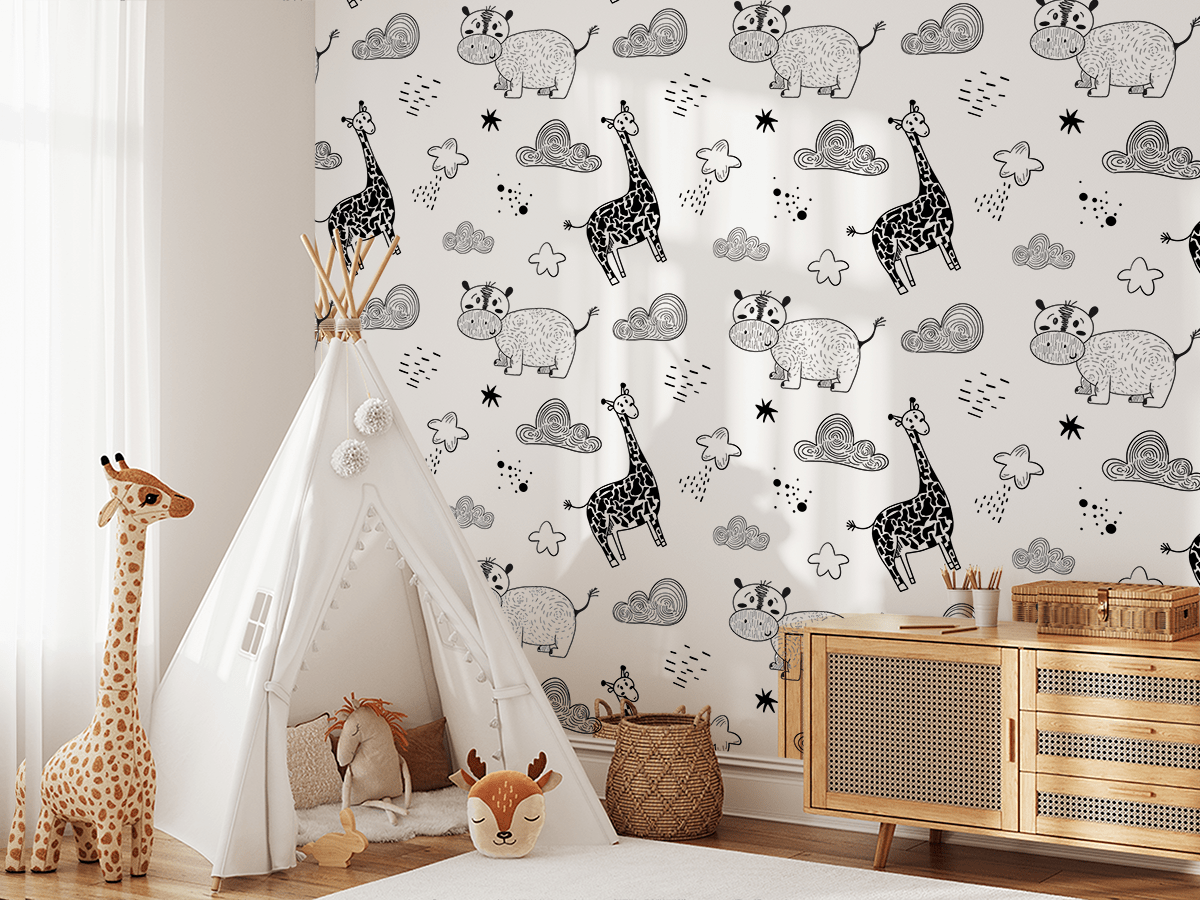 Wprowadź do swojego wnętrza magiczny klimat dzięki fototapecie „Zwierzęta w chmurach”. Ten uroczy, czarno-biały wzór z wizerunkami żyraf i hipopotamów, otoczonych chmurami i gwiazdkami, stworzy w Twoim domu wesołą i bajkową atmosferę. Delikatne linie, zabawne postacie oraz subtelna kolorystyka idealnie sprawdzą się w dziecięcych pokojach, przedszkolach czy przestrzeniach pełnych wyobraźni.